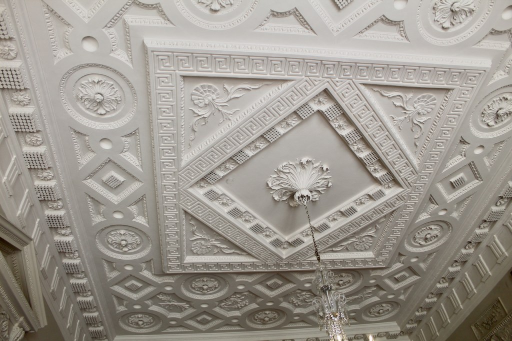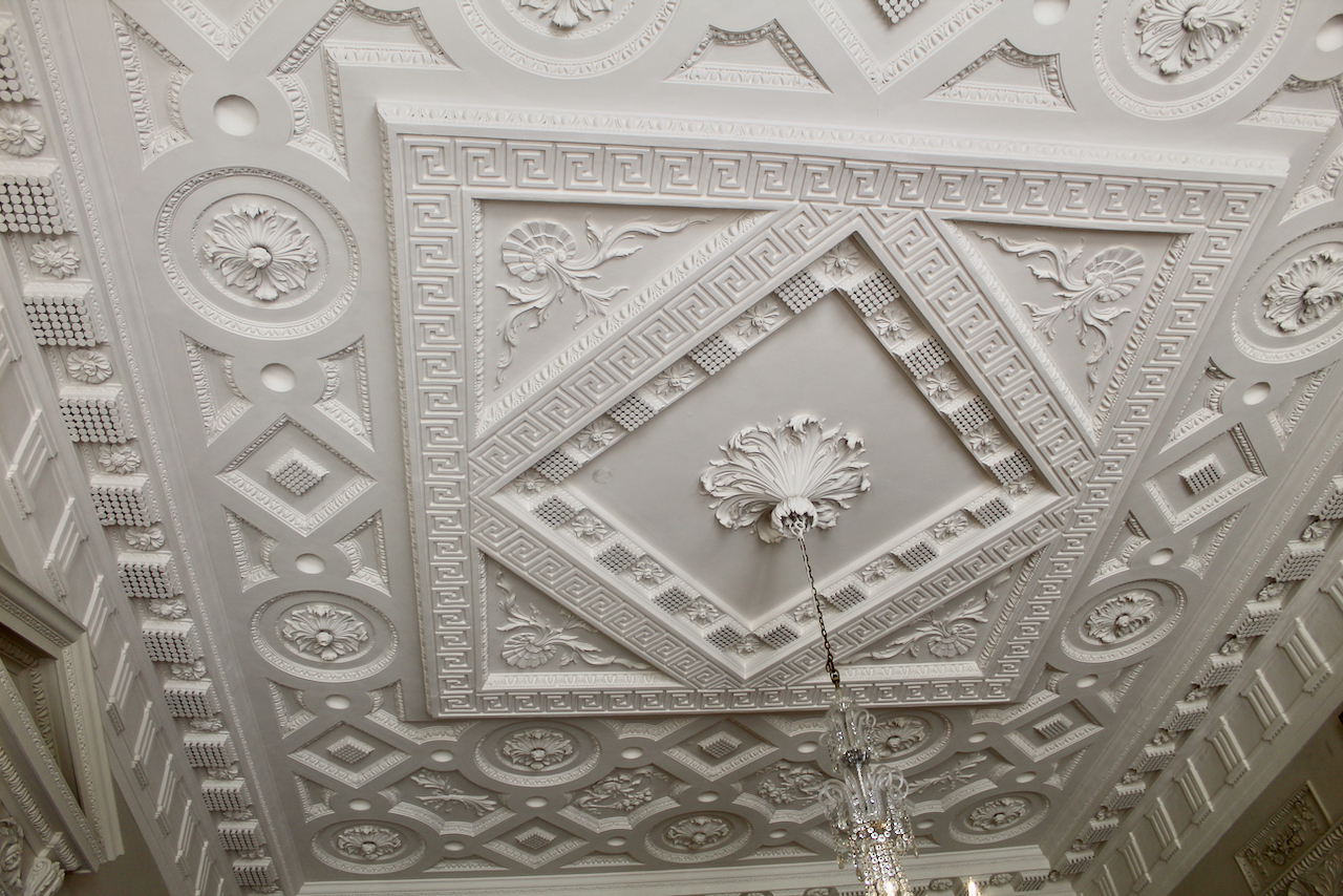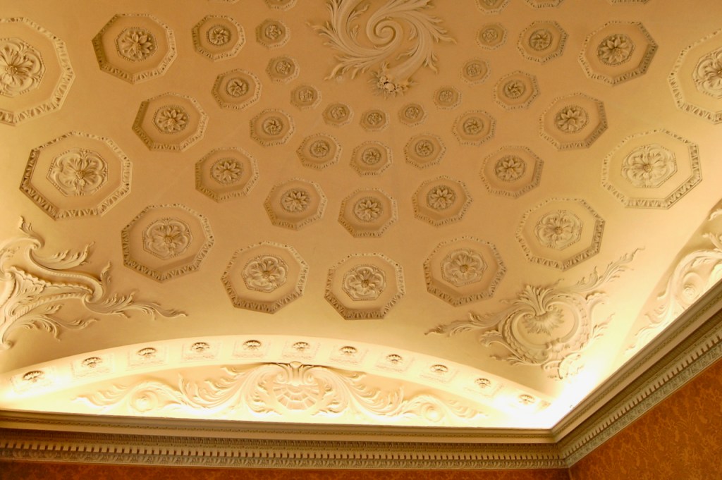 “The new extension provided a bow ended room on the garden front, a large bedroom above and a grand staircase, lit by a tall round-headed window. Pretty plasterwork in the manner of James Wyatt was also introduced at the time, most notably in an arched alcove in the bow-ended room, which is likely to have been the original dining room. The alcove is filled with a shallow fan, and delightfully cursive sprays of vine leaves, and is flanked by a pair of classical vases on pilasters of foliage with naive Corinthian capitals.