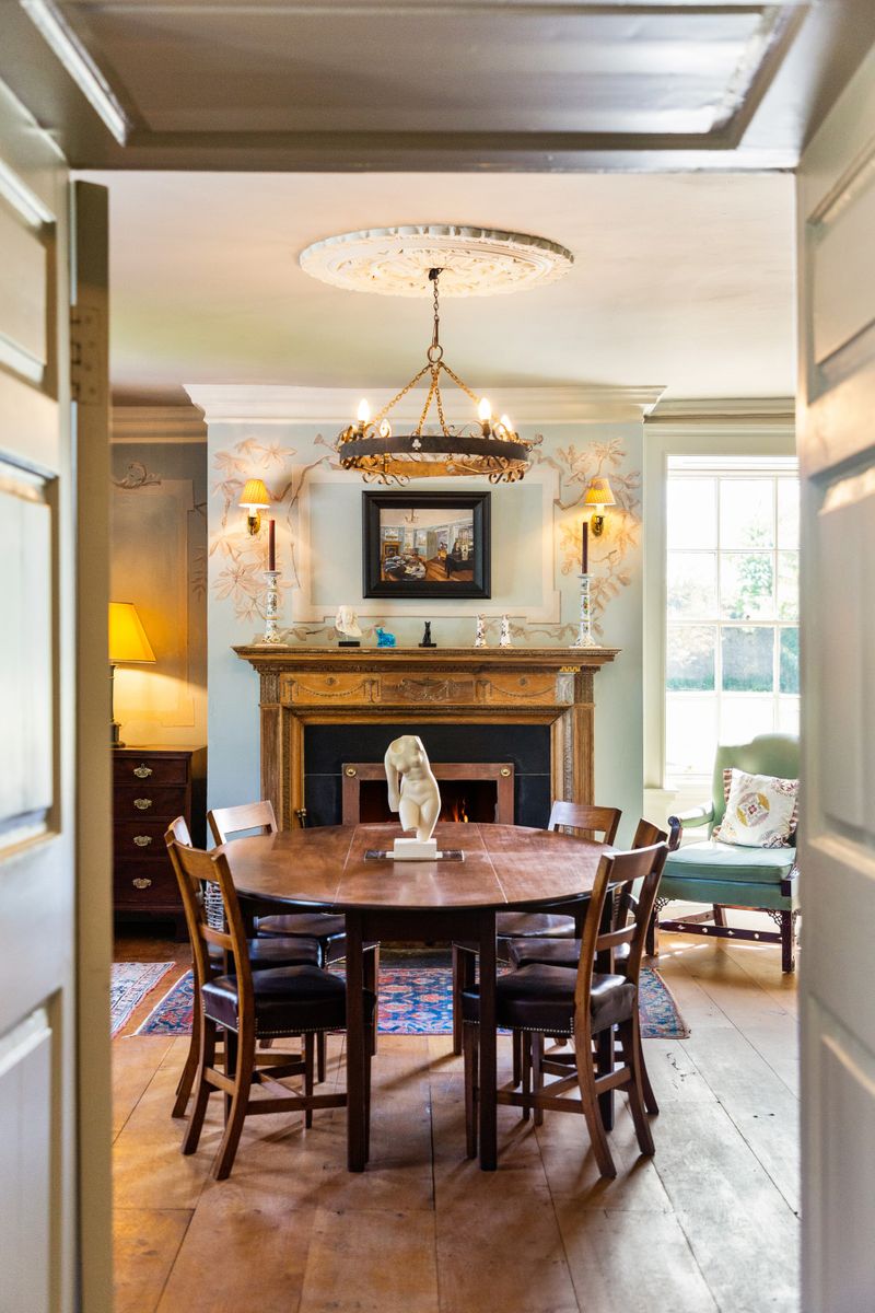 “The door immediately to the right of the stairs leads to the Apollo Room, named after the featured frieze of Apollo the music-maker holding court with attendent putti playing a variety of instruments. The adjoining Diana Room depicts Diana, patron of the chase, in a chariot drawn by stags. The design is taken directly from Pergolesi, however, Stapleton added the outer circle of flowers.