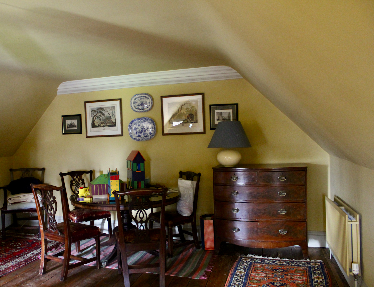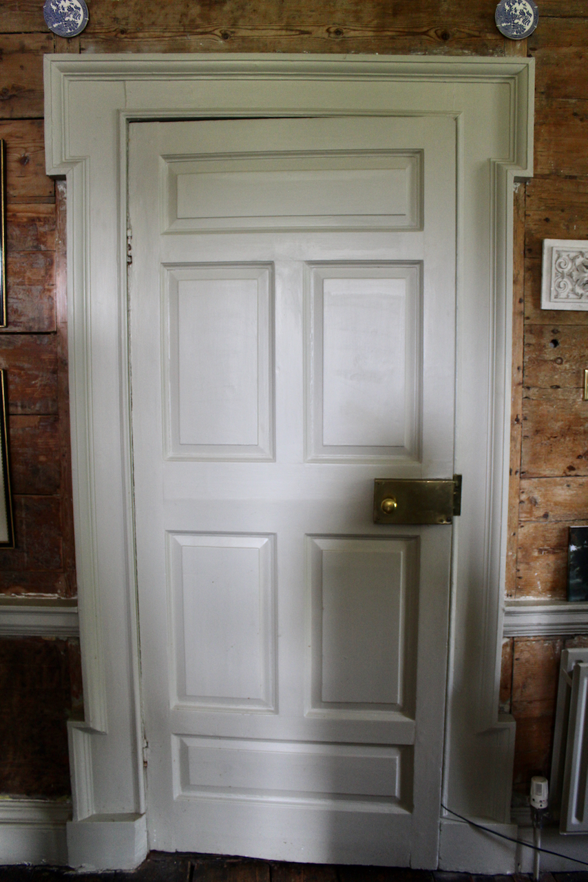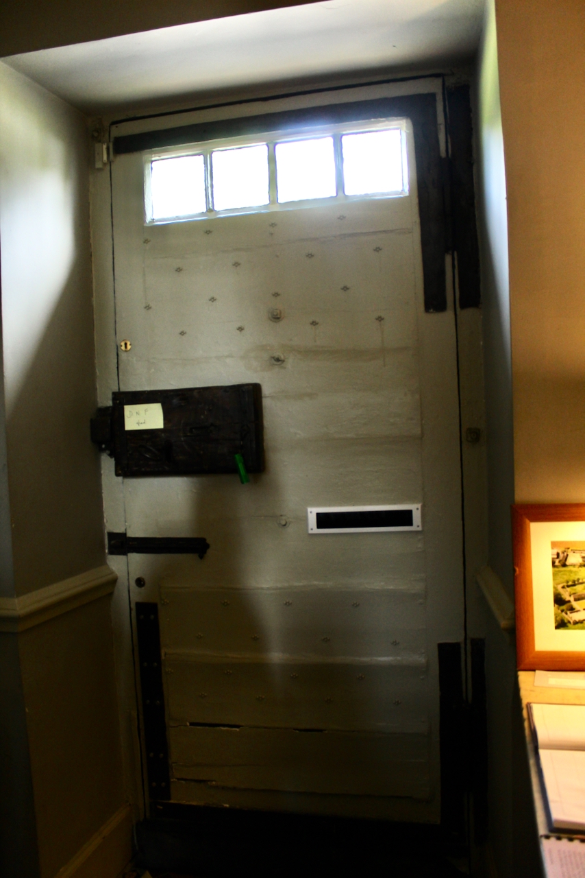The Dining Room. “This room remains unrestored which allows us to see the changes and alternations which were made to the building over the years. The door on the left-hand (northern) wall is typically eighteenth century in style and decoration. However to the left of it a trace of the original Elizabethan doorway is visible. It was blocked up during the 18th century refurbishments. The bow extension to the eastern side of the building is another change dating to that period which added space and brought more light into these rooms. The 18th century timber wall panelling and lining paper survives in this room. It is likely that the walls were covered with silk. Although designed as a dining room, in the 20th century the Jesuits used this room as a library.“