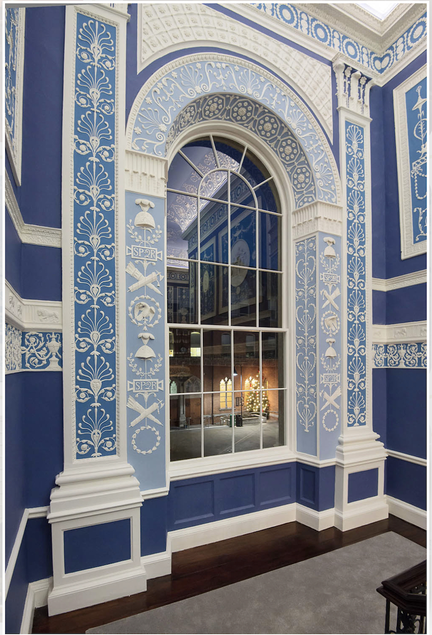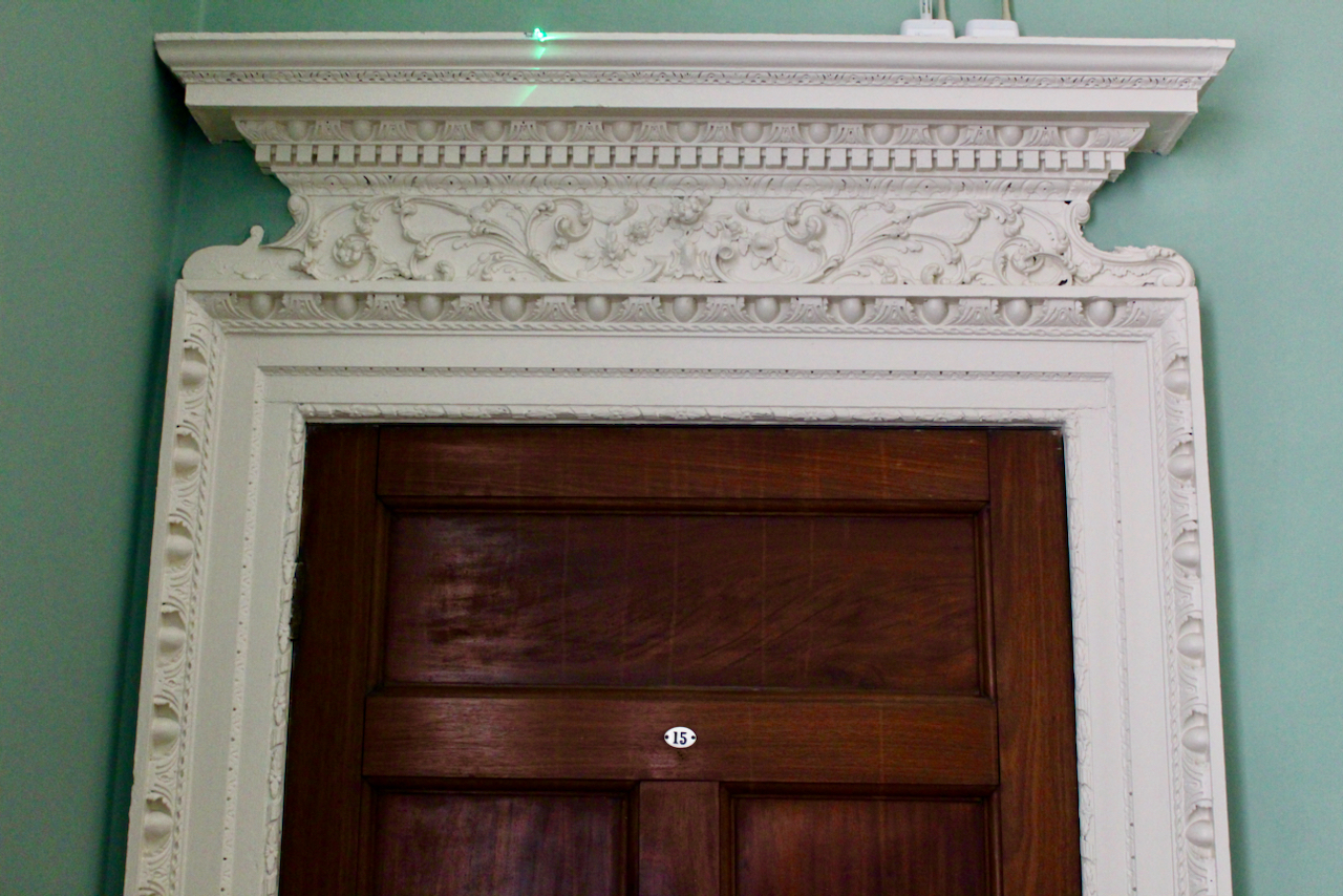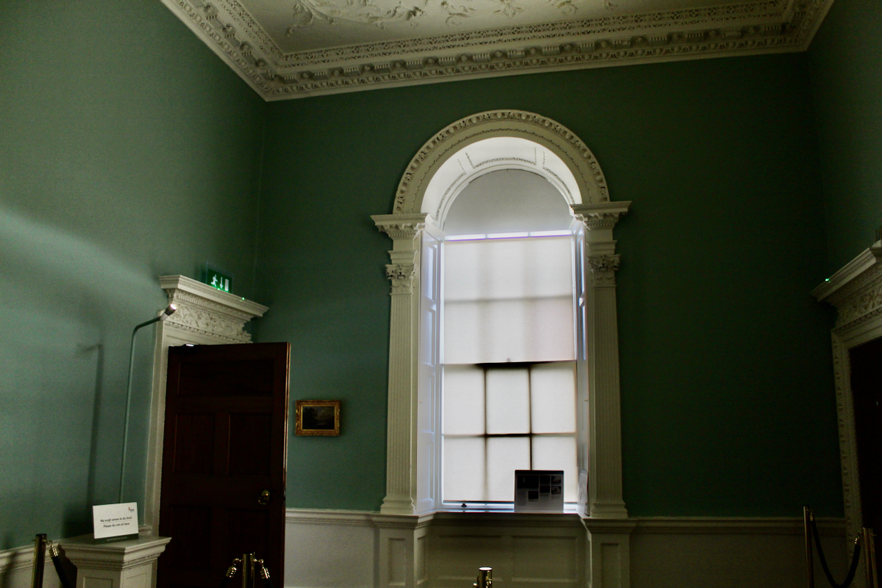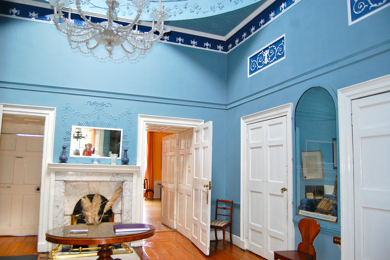 “The ground floor rooms were intended for everyday and business use and therefore are minimally ornamented. However when one ascends they will encounter Stapleton’s stucco-work that depicts scenes from Greek and Roman mythology.On the half-landing the Bacchanalia is celebrated. The left panel depicts Bacchus with his thyrsis and staff, the right panel is Ceres with her cornucopia. The central oval shows Cupid being demoted by the three Graces. The arched window is ornamented with symbols of the authority of ancient Rome. The tall pilasters on each side have the Green anthemion (honeysuckle) motifs.