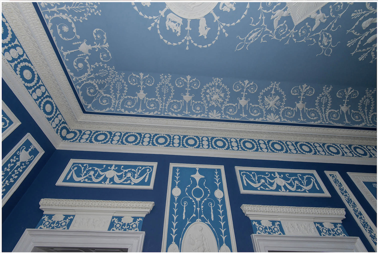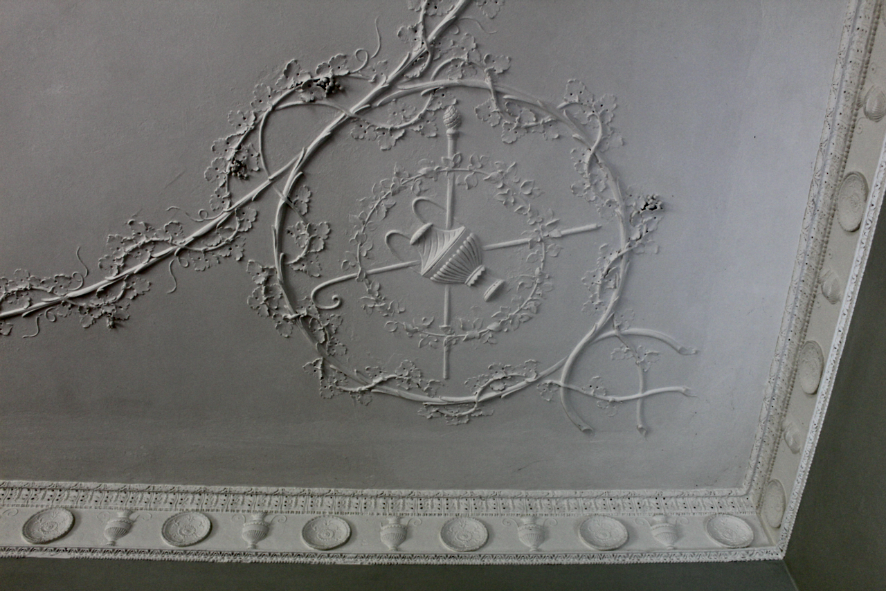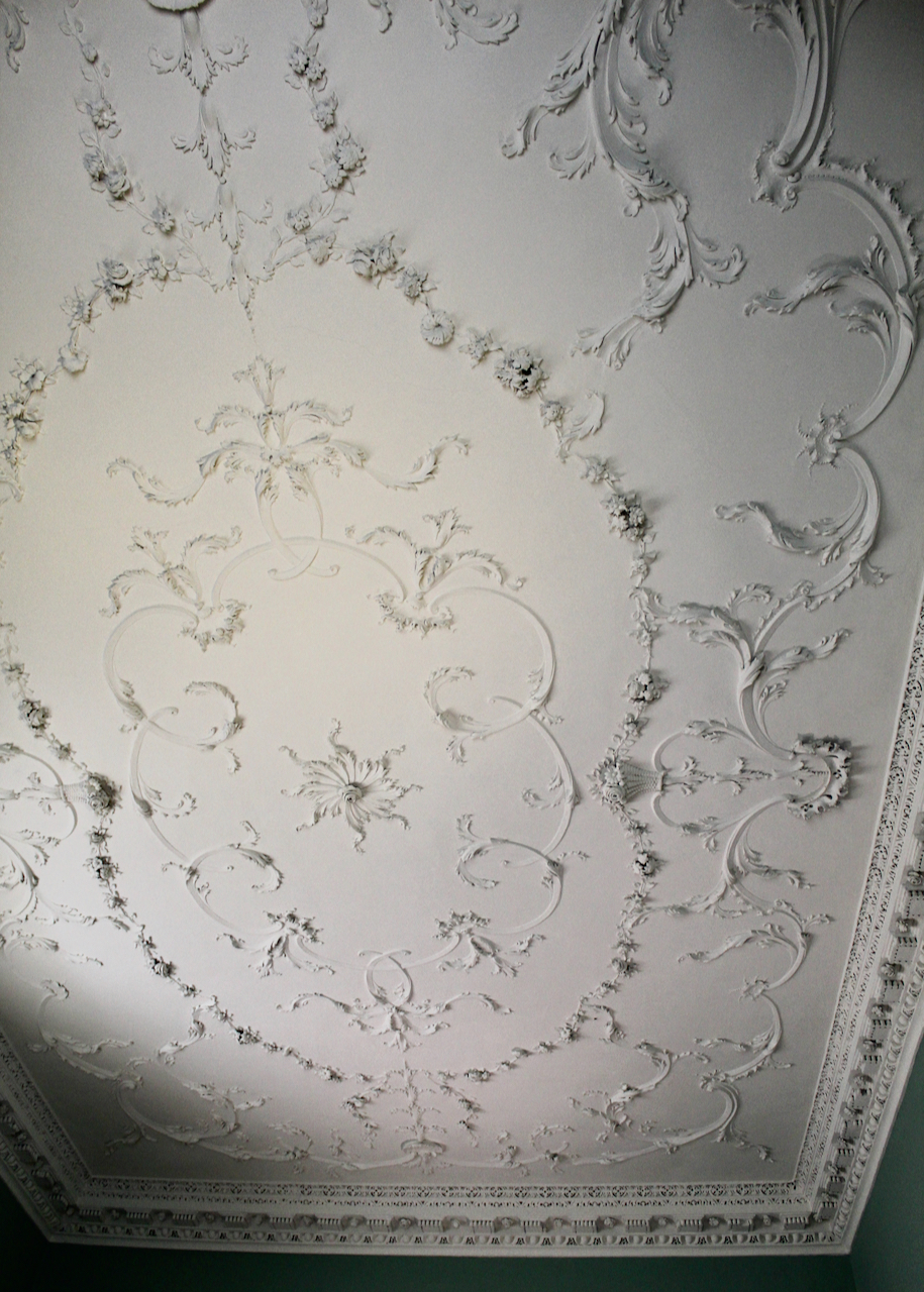 One of the more outstanding features of the house is the stucco-work of Adamesque style popularised by Robert and James Adam. This can be seen in the ornamental surrounds, wherein pictures are framed in plaster rather than oil.