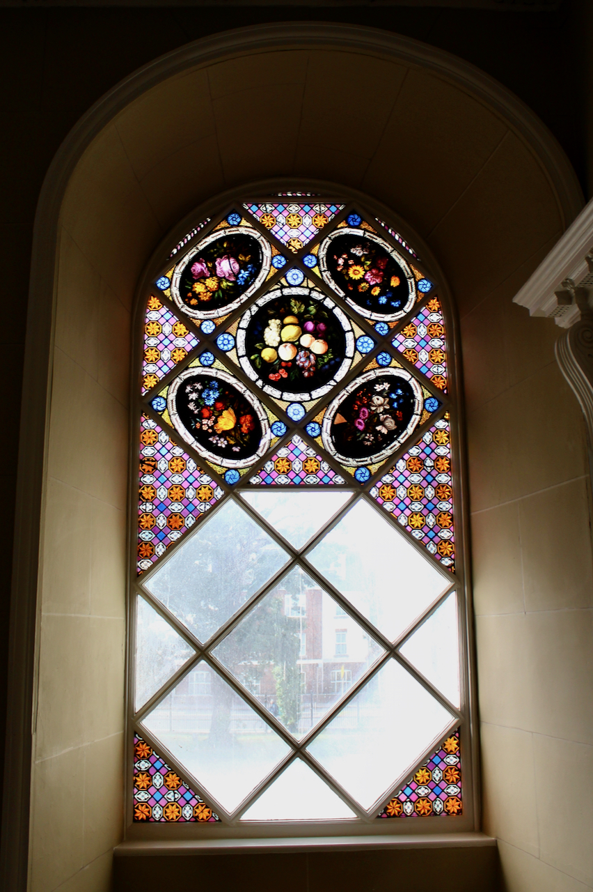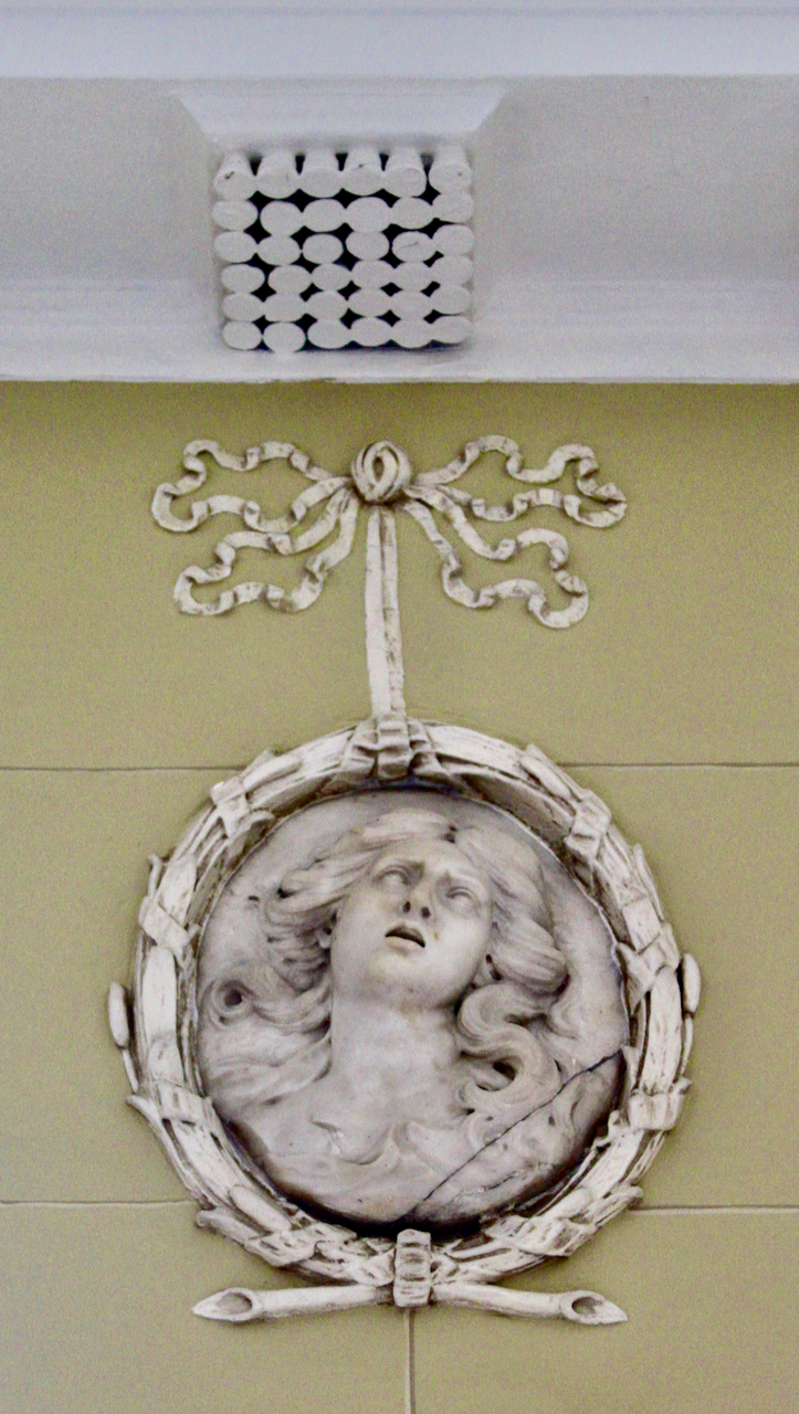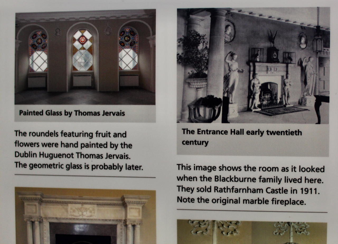 From an information panel in the entrance hall: “This room is believed to have been built to a design by the influential architect Sir William Chambers (1723-1796). Despite never visiting Ireland, Chambers left a significant mark on Dublin where he also designed the Casino at Marino, Charlemont House on Parnell Square, and much of Front Square in Trinity College. The floor and free standing Doric columns are in Portland stone. The painted glass panels featuring fruit and flowers are believed to be by the Dublin Huguenot artist Thomas Jervais (d. 1799). The marble relief busts on the walls depict well known figures from the Classical and Renaissance past, including the Egyptian queen Cleopatra and Italian poet Dante. These sculptures seem to have been acquired in Italy and would have been incorporated into the design of the Entrance Hall to signal the taste and refinement and learning of the Loftus family. The original eighteenth century marble fireplace was replaced with a painted timber one in around 1913. It was one of several of the original fireplaces which were removed and sold when the Blackburne family left the castle in 1911.“