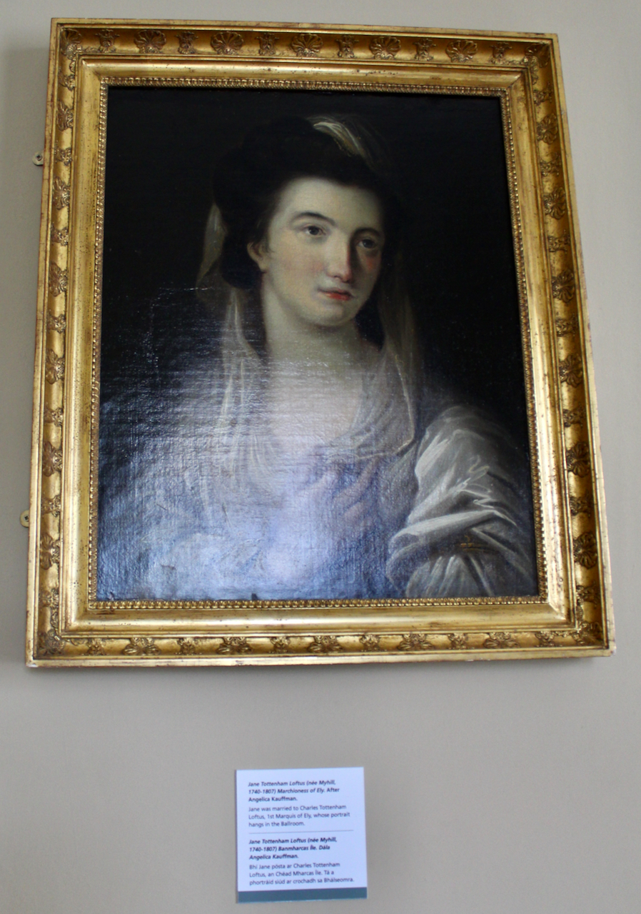 Painting by Angelica Kauffman, who spent several months in Dublin in 1771. It shows Henry Loftus 1st Earl of Ely of the 2nd Creation (1709-1783) with his wife Frances, her nieces and an exotic trophy servant, a young Indian page in Oriental dress carrying a cushion with two coronets, symbolising the title the Earl had just received. The older niece, Dolly Monroe, was Classical costume. Her younger sister Frances plays a fashionable aria on the harpsichord.