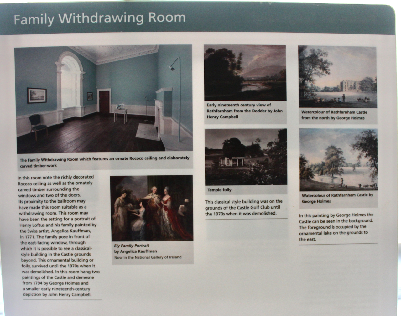 Henry Loftus, 1st Earl of Ely of the 2nd Creation (1709-1783) by Angelica Kauffman. Henry inherited Rathfarnham Castle and its demesne in 1769 upon the death of Nicholas, his nephew. Nicholas had been the subject of a long running legal case concerning the state of his mind and Henry had supported him throughout. The Swiss artist Angelica Kauffman is known to have spent several months in Dublin in 1771. As well as this portrait which was probably completed to mark Henry’s elevation to the earldom of Ely, this renowned painter also completed a group portrait of Henry and his family (now in the National Gallery) as well as a series of ceiling paintings for the long gallery on the first floor depicting scenes from Greek mythology.