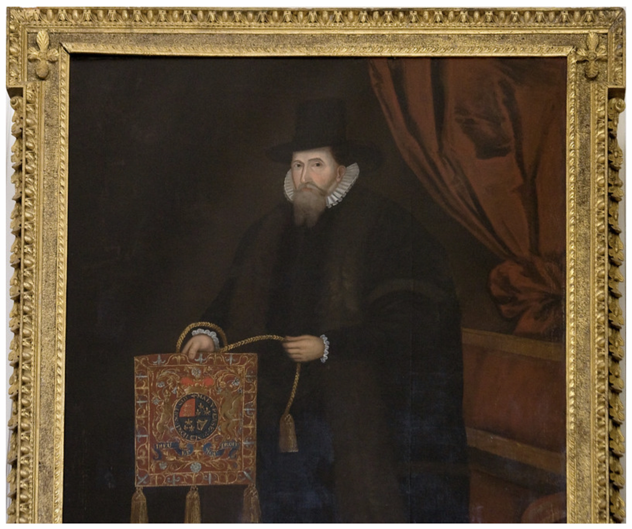 Archbishop-Chancellor Adam Loftus (1533-1605). The portrait is in Trinity College Dublin, as he was the first Provost. He was also Keeper of the Great Seal of Ireland, and he is here holding the embroidered purse which held the seal.Adam Loftus (1533-1605), Lord Chancellor, 1619. Painting hangs in Malahide Castle, courtesy of National Museum of Ireland.This shows the special shape of Rathfarnham Castle’s flanker towers.
