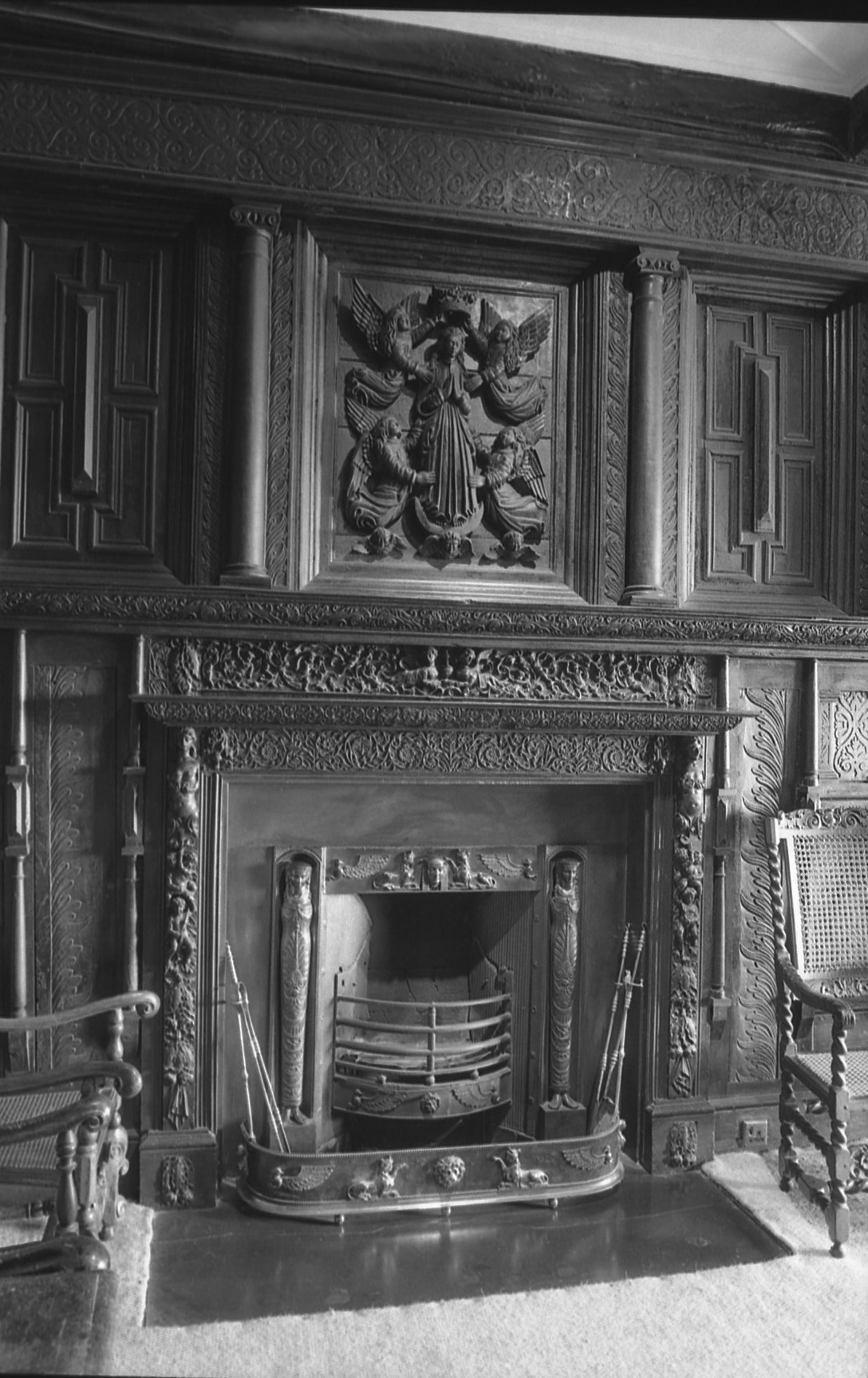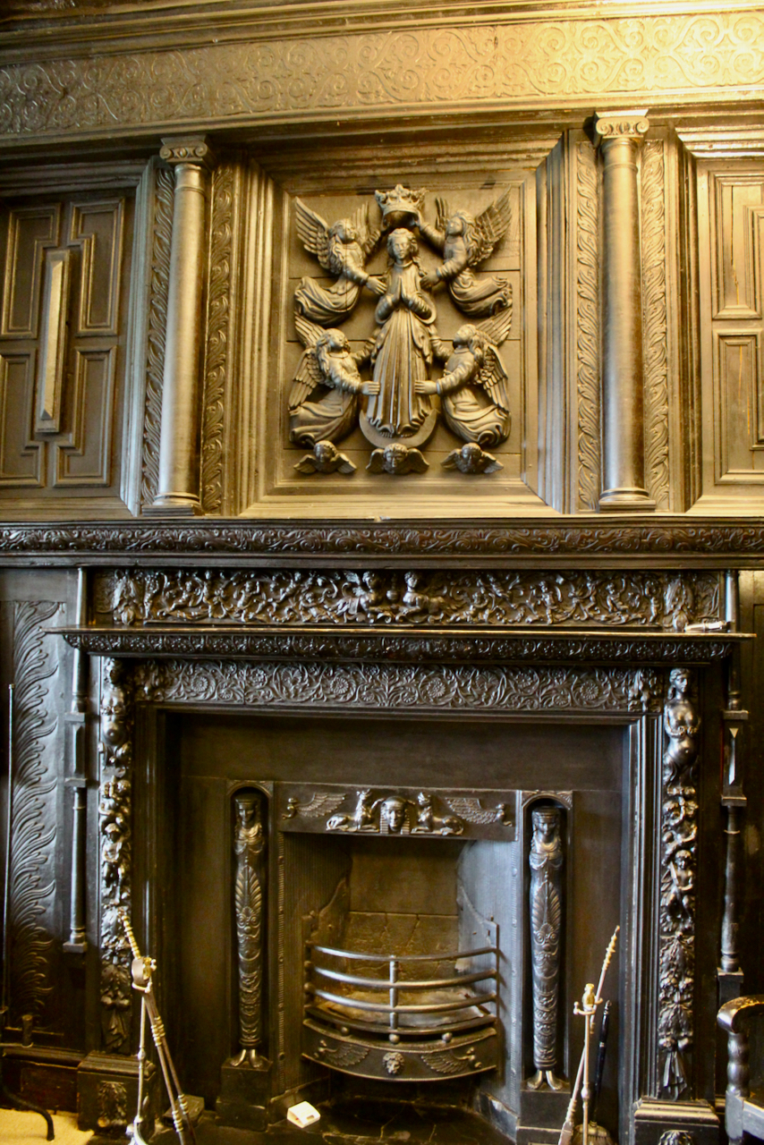 According to tradition, Mark Bence-Jones tells us, the carving of the Coronation of the Virgin above the fireplace of the Oak Room miraculously disappeared when the castle was occupied Myles Corbett and reappeared when the Talbots returned after the Restoration. This would have been a Catholic tale, as Protestants do not believe in the virgin birth and would not venerate Mary the mother of Jesus in the way that Catholics do. The carving is seventeenth century Flemish.