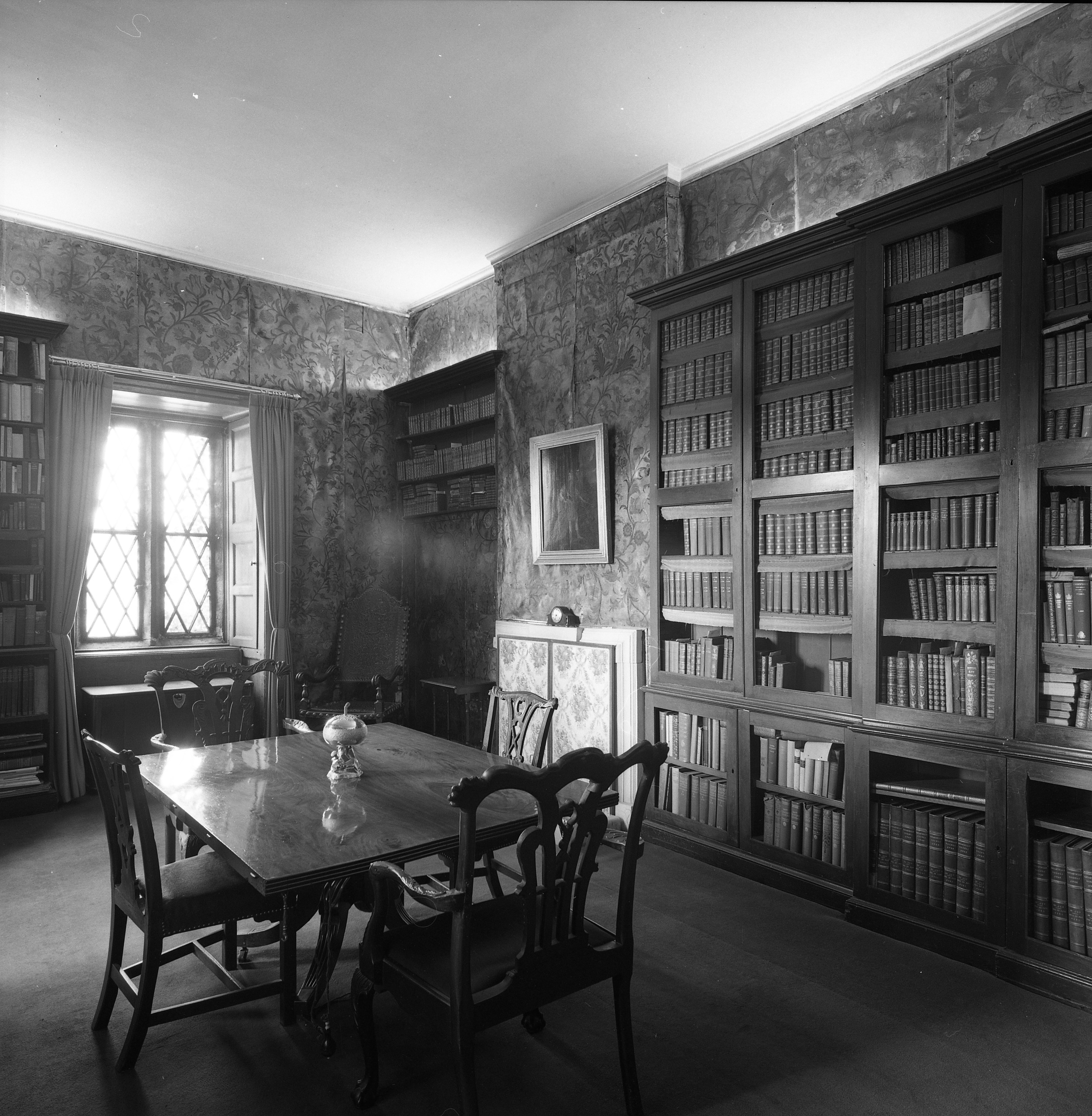 Malahide Castle 1976, Dublin City Library and Archives. (see [5])The library, Malahide Castle, Dublin, photograph byPocket Squares . The wallpaper is of calfskin with gold and silver leaf and is three hundred years old. The room was used as a dining room in the 1970s by the Talbots.