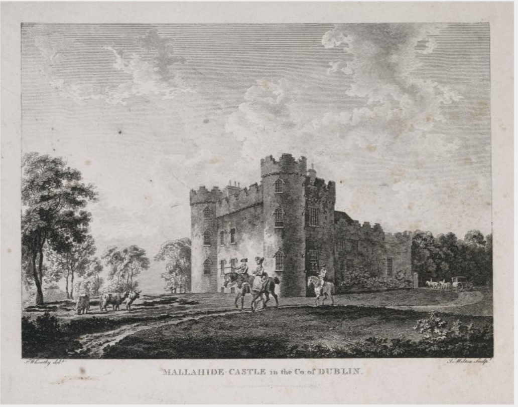The Castle from the Pleasure Garden, photograph by George Munday, 2014, Tourism Ireland. The towers were added in 1765.(see [1])Malahide Castle, engraving of picture by Francis Wheatley, photograph courtesy of National Gallery of Ireland.