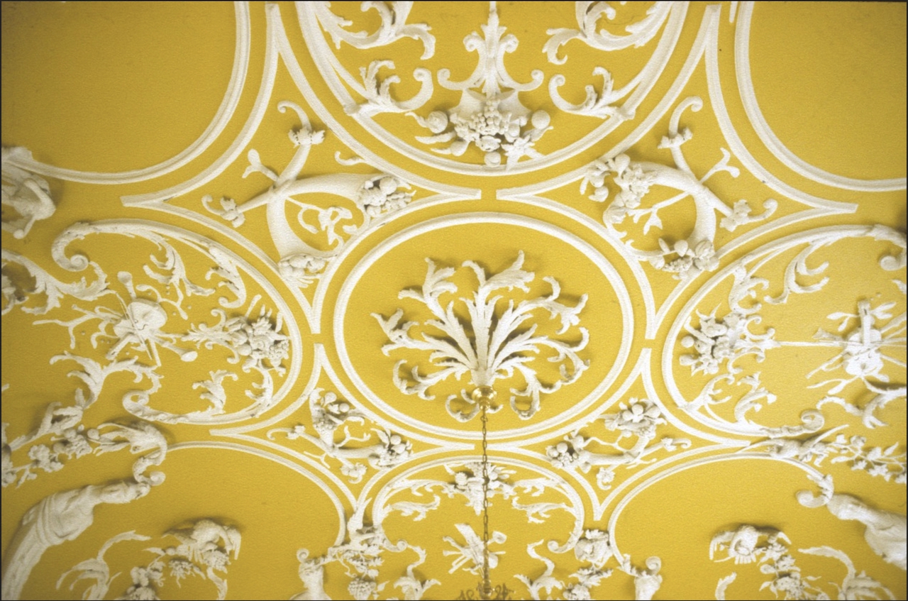 “West is often confused with Robert West (d. 1770), artist and draughtsman, who lived in Dublin at the same time and was a teacher of applied arts such as stucco design as well as life drawing. Though there is no evidence that the two men were blood relatives, they would almost certainly have known of each other’s work. Continental prints, showing ceiling designs by artists such as Bérain, Pineau, and Boucher, were commonly circulated among craftsmen and students in Dublin during the 1750s and 60s. Robert West the artist may have provided inspiration for some of the motifs (such as birds, swags, and musical instruments) used by West the stuccodore. The design and fixing of plasterwork was a complex collaborative venture involving many hands, and it is rarely possible to attribute plasterwork designs to a single artist. It is known that Robert worked alongside his brother John West and he would have required a team of assistants.“