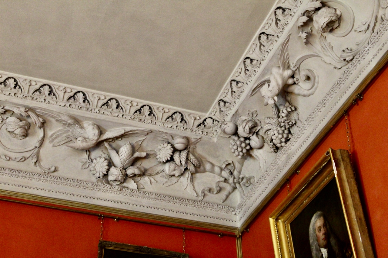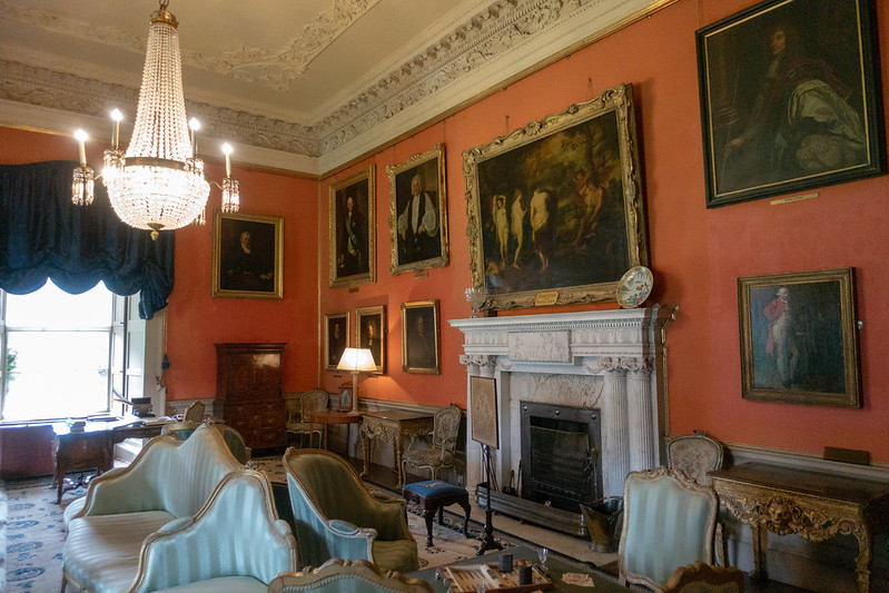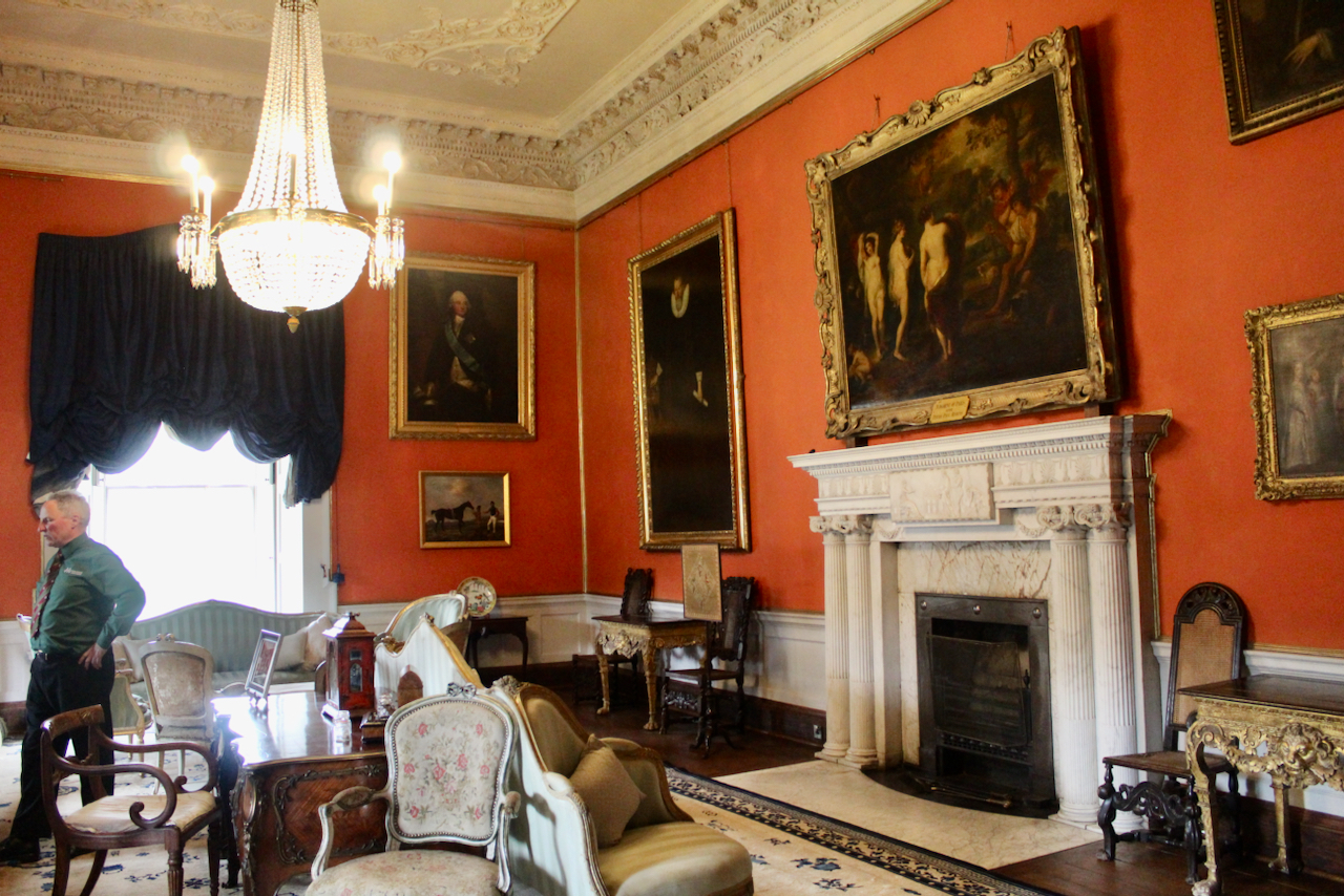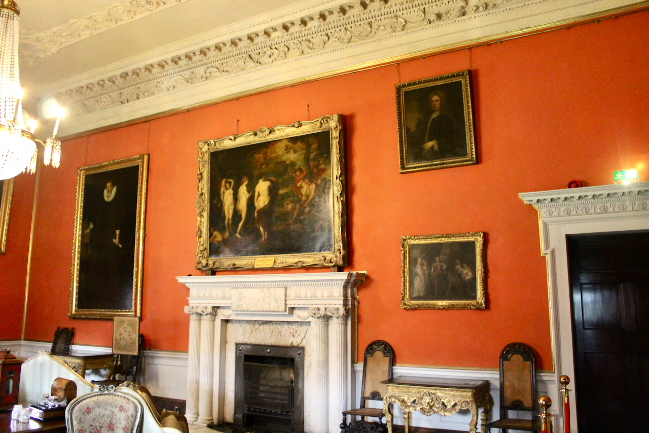 The pair of “Malahide Orange” painted drawing rooms which contain rococo plasterwork in the manner of Robert West and the Dublin school also have decorative doorcases and marble fireplaces and are now filled with portraits and paintings.