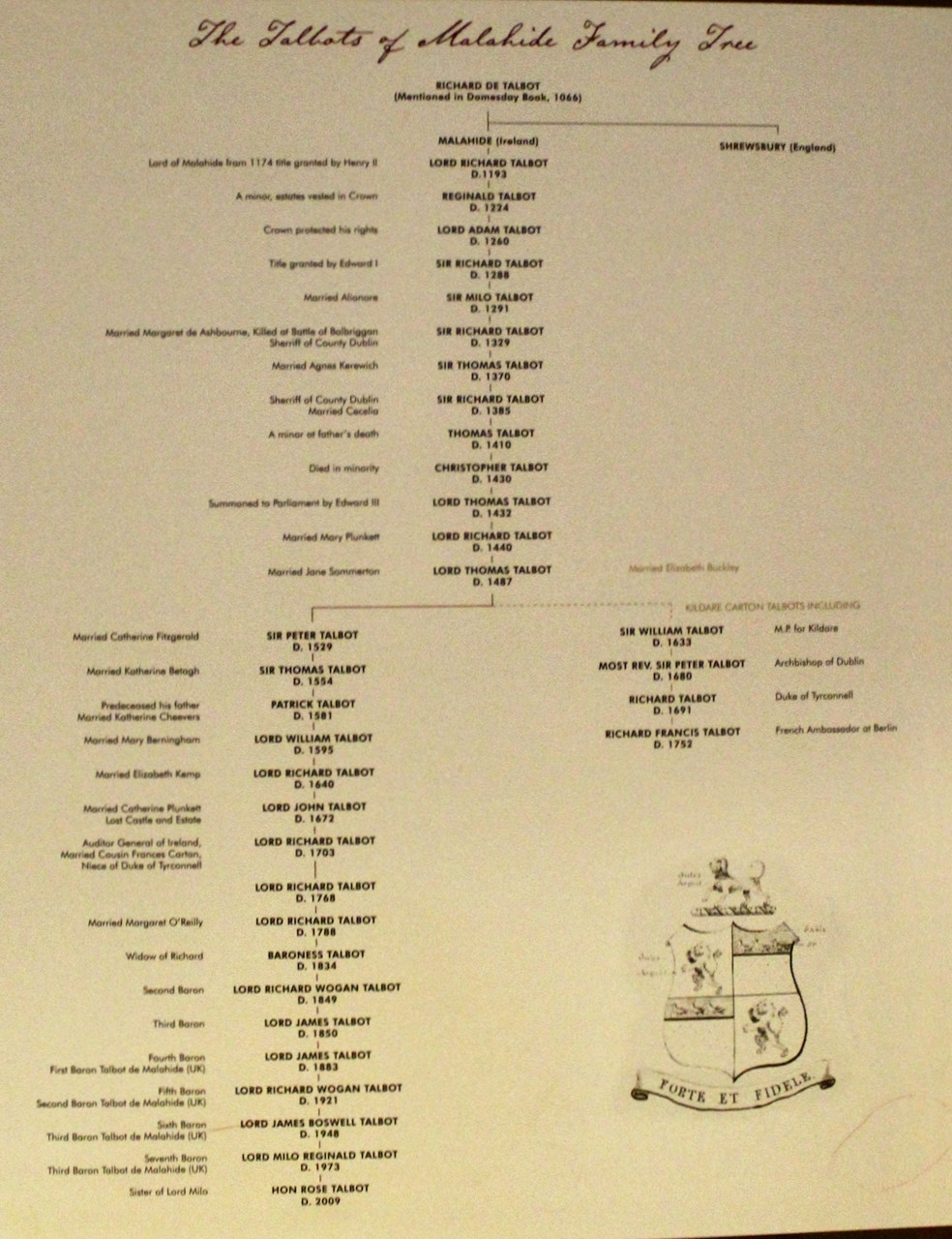 Displayed in the castle, this family tree includes the Talbots of Carton.