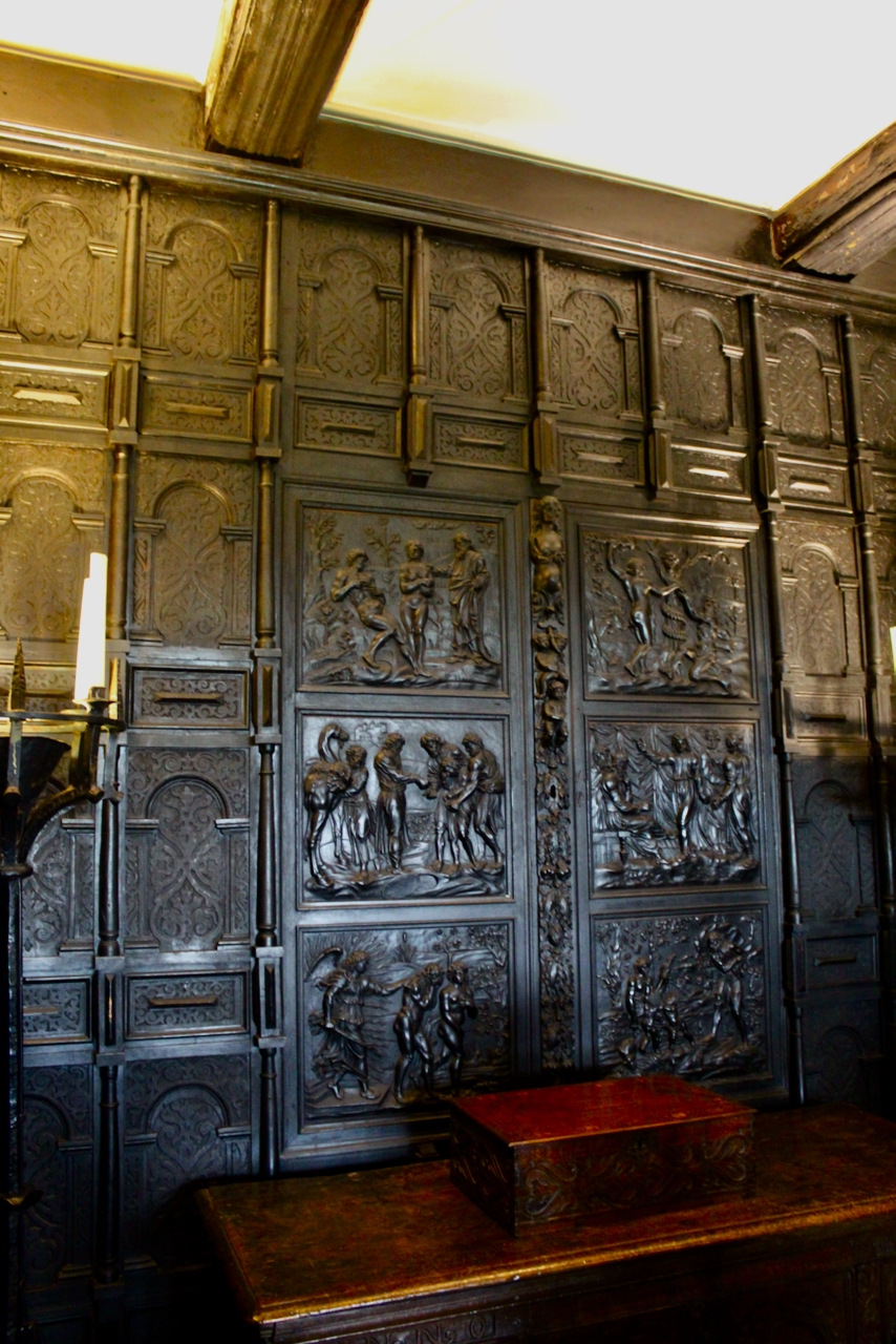 Behind the carved panels on the wall to the right hand side of the fireplace is a door that acted as an escape route for Catholic priests when Catholic mass was held in this room.