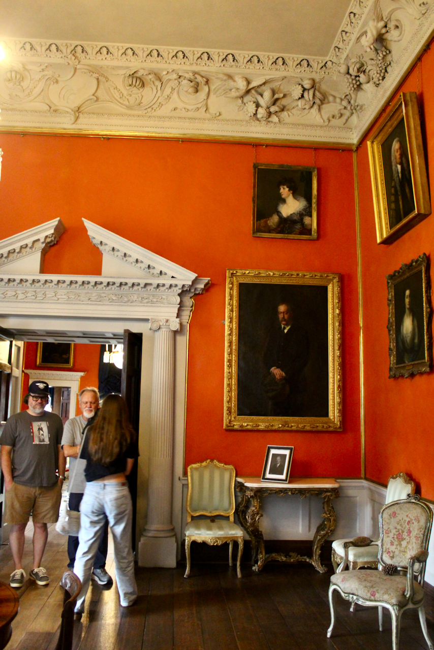 Mark Bence-Jones continues: “The doorway between the two rooms has on one side a doorcase with a broken pediment on Ionic columns. The walls of the two drawing rooms are painted a subtle shade of orange, which makes a perfect background to the pictures in their gilt frames.