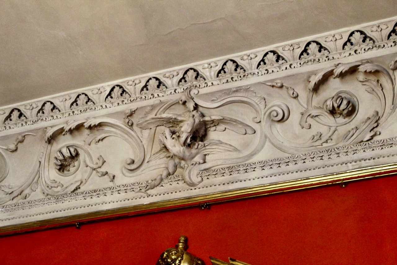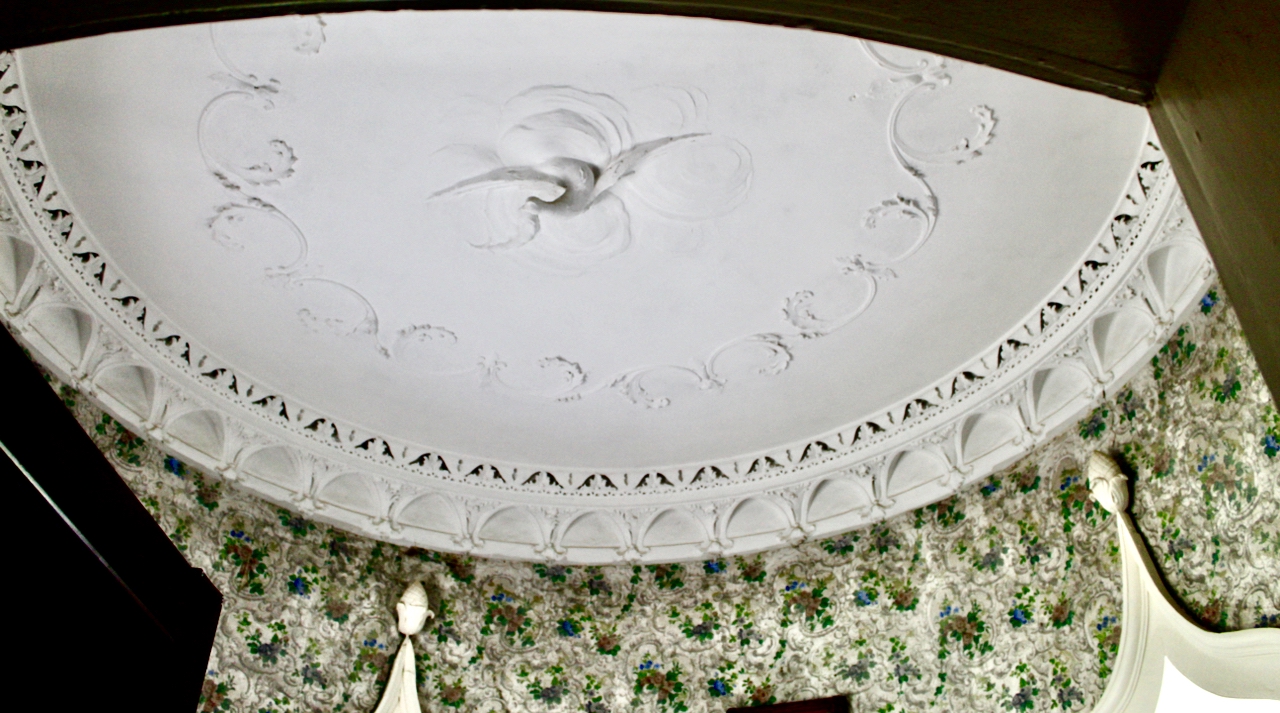 “The West circle of stuccodores was instrumental in encouraging imaginative rococo plasterwork in Ireland during the 1750s and 1760s. West was a magpie in terms of style and deployed elements of the chinoiserie (winged dragons and ho-ho birds) alongside the more conventional swirling acanthus leaves commonly found on contemporary continental prints. Indeed, this eclectic mix can be seen in many Dublin town houses and in country houses as far afield as Florence Court, Co. Fermanagh.“