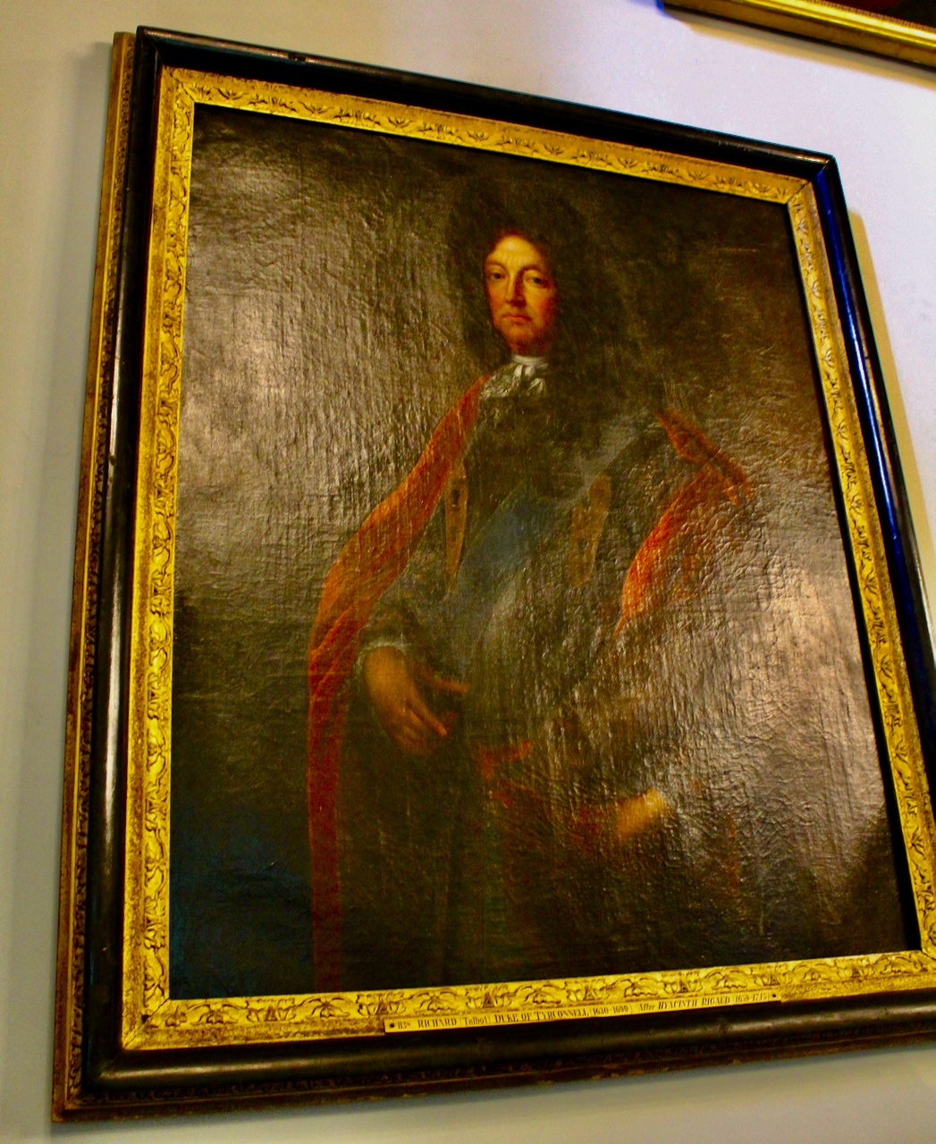 Centre, Richard Talbot, Earl of Tyrconnell. Portrait by Francois de Troy, court painter for King James II in his exile.Above him in the centre is John Talbot 1st Earl of Shrewsbury c. 1670.In the top right corner is Catherine Nugent (d.1756) by James Latham c. 1725.Richard, 5th Viscount Molyneux of Maryborough (1679-1738) and Mary, 5th Viscountess Molyneux (1680-1766) by Garret Morphy, c. 1705, above Morris Hayes (2025).
