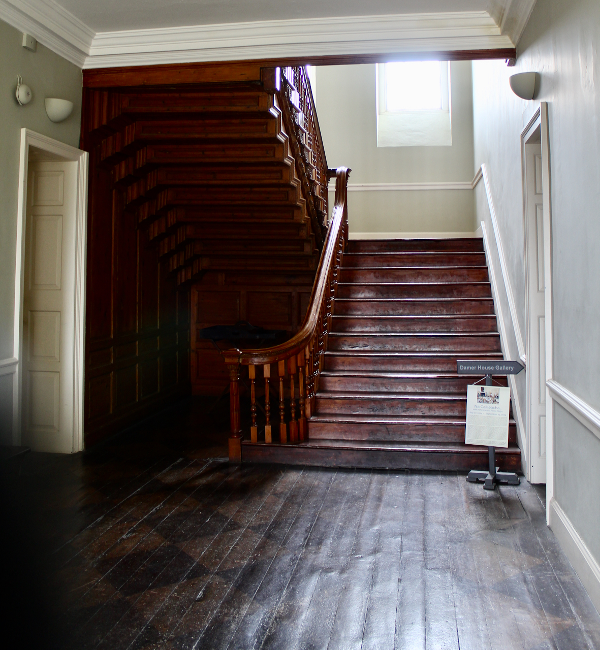 The wooden staircase leads up to a spacious upper hall, with four bedrooms off it. Stairs lead from this hall to the upper level, to which we did not ascend. The large size of the upper hall with its impressive height adds to the grandeur of the house.