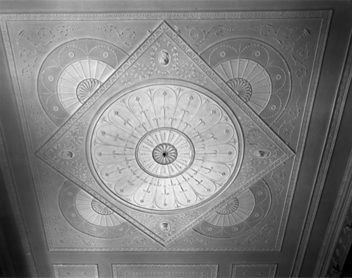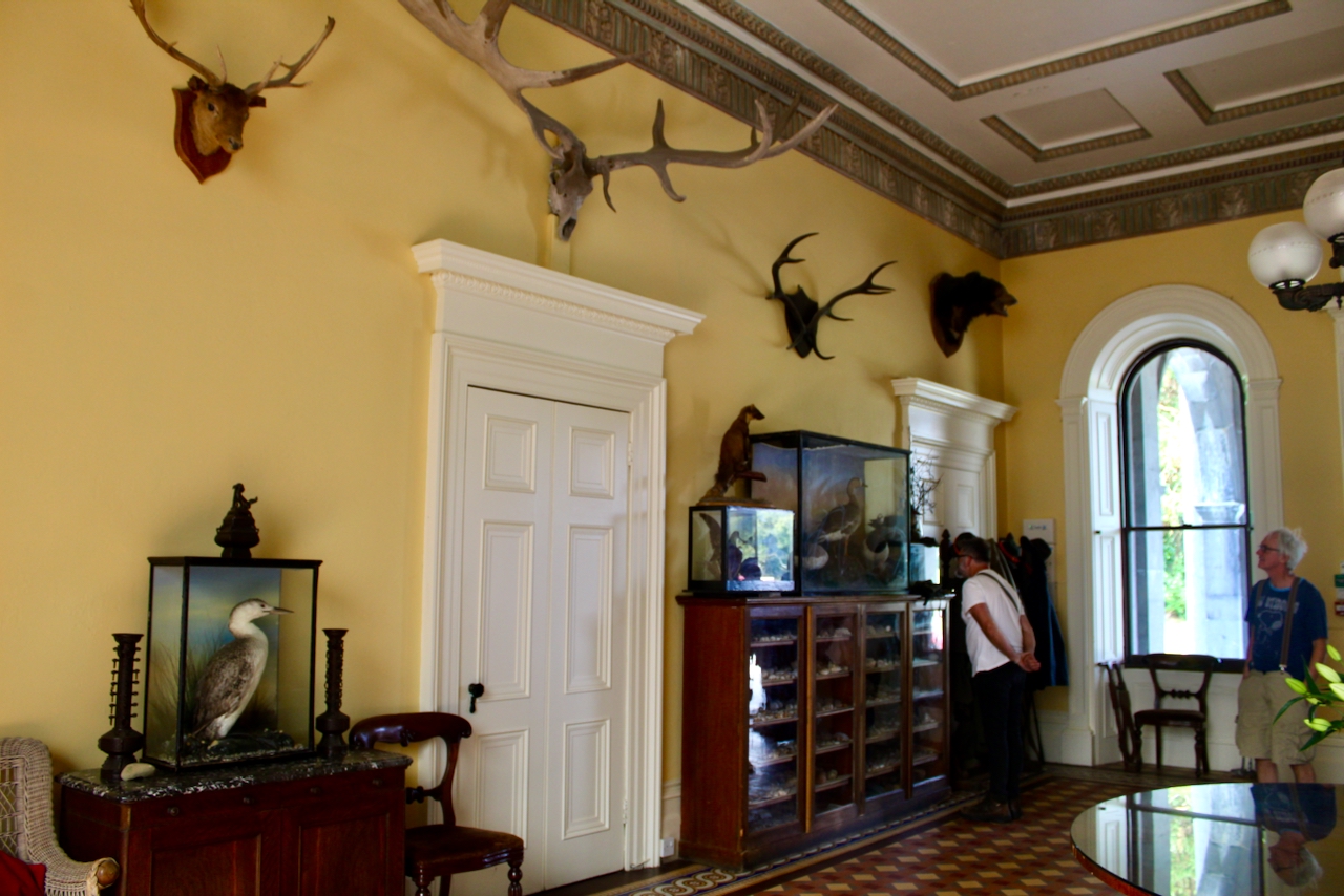 The ceiling has a Doric freize and a rose of acanthus leaves. A collection of stuffed birds and trophies line the wall, and a fine chimneypiece original to the house. [see 2]