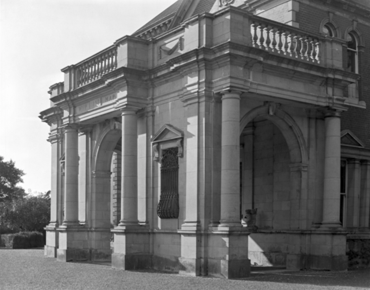 The newer entrance has a large arched single-storey porte-cochére with coupled engaged Doric columns at its corners and two small arched side windows. Above is another pedimented Wyatt window in a larger pediment over two pairs of Ionic pilasters. The centre windows on either side of the porte-cochére on the ground floor are pedimented and on the upper storey the centre windows have curved arch pediments. The other windows have flat entablatures.