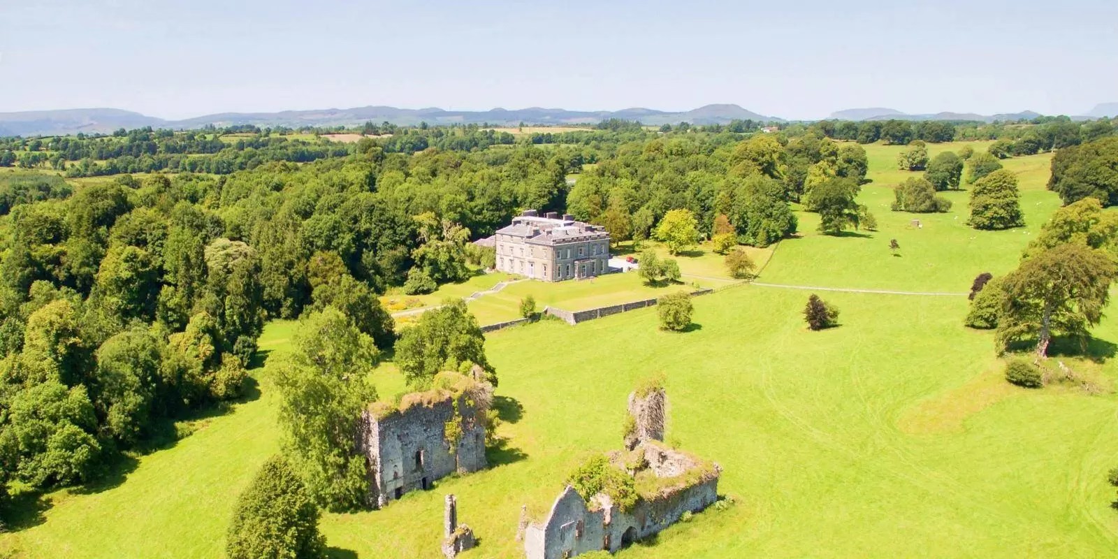 “Emulating Arcadia, a pastoral paradise was created to reflect Man’s harmony with the perfection of nature. As is the case at Larchill, a working farm with decorative buildings (often containing specimen breeds of farm animal) was situated in landscaped parkland ornamented with follies, grottos and statuary. Tree lined avenues, flowing water, lakes, areas of light and shade and beautiful framed views combined to create an inspirational experience enabling Man’s spirit to rejoice at the wonder of nature.“