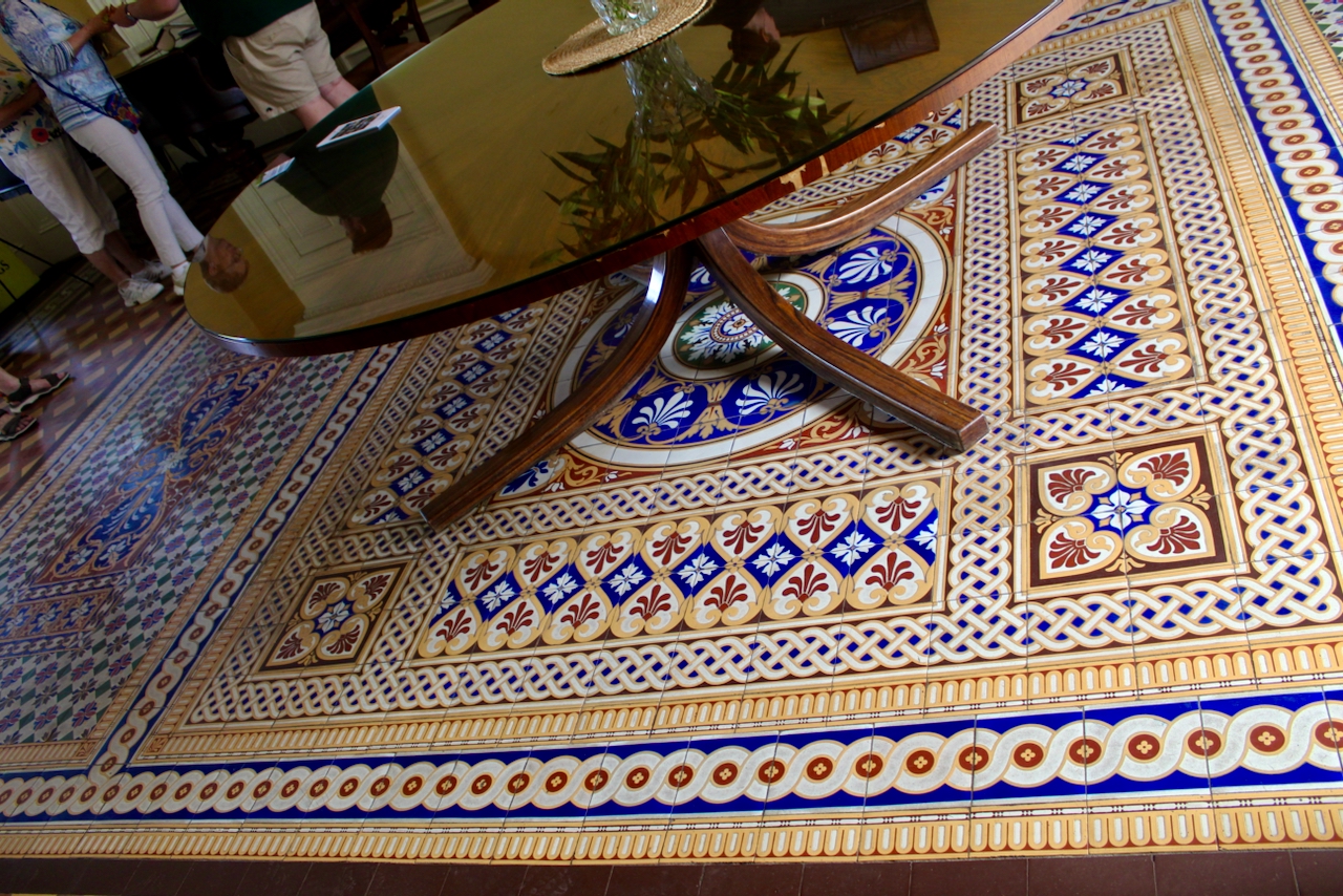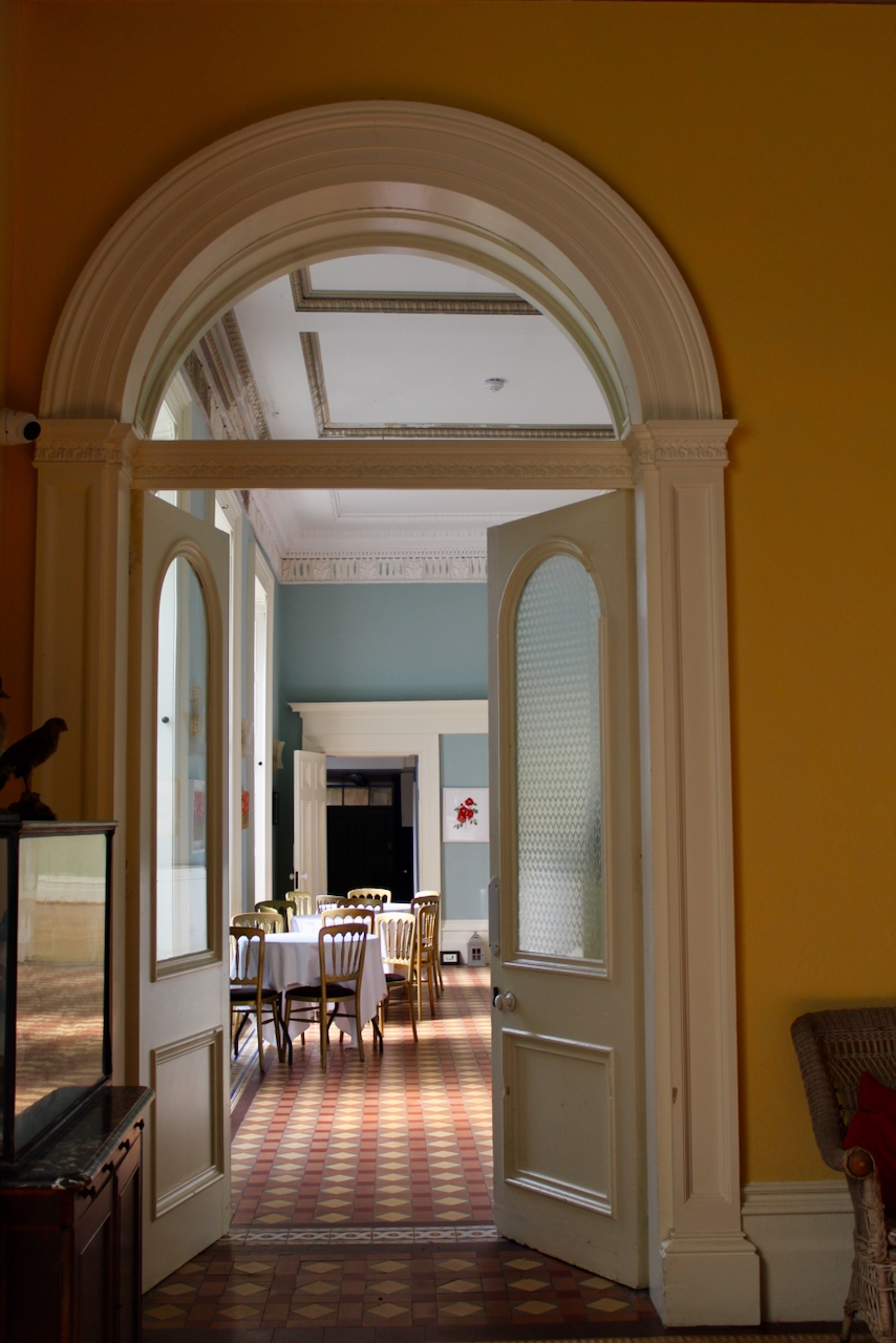 We gathered inside the front hall for the tour, with its impressive tiled floor and geometrically patterned ceiling. It has carved decorative doorcases and arched carved and shuttered side lights by the front door, and a large window facing the front door lights the room.