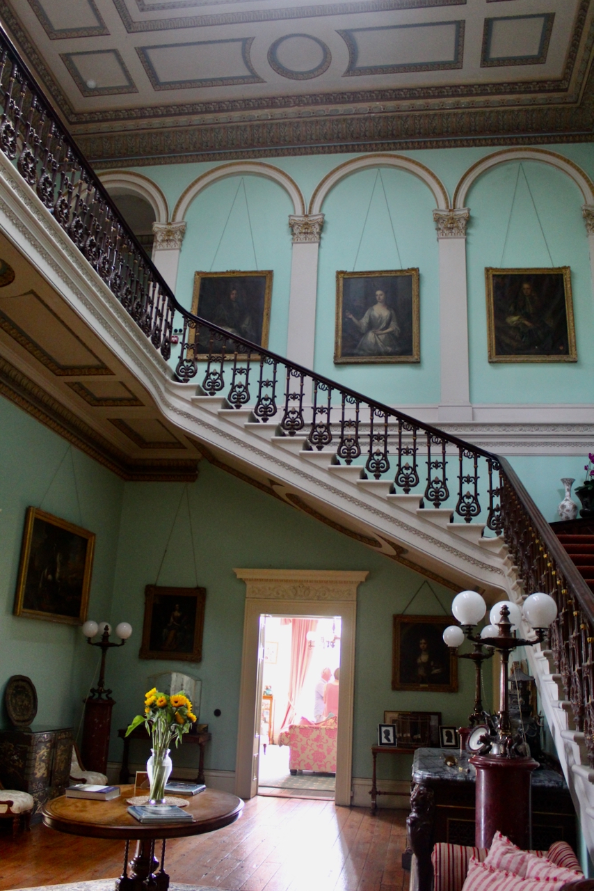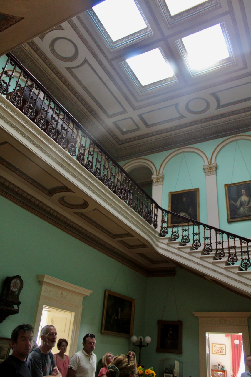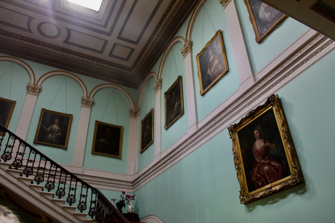 From the front hall we entered the top-lit double-height vestibule with a grand sweeping staircase and gallery lined with paintings of ancestors.