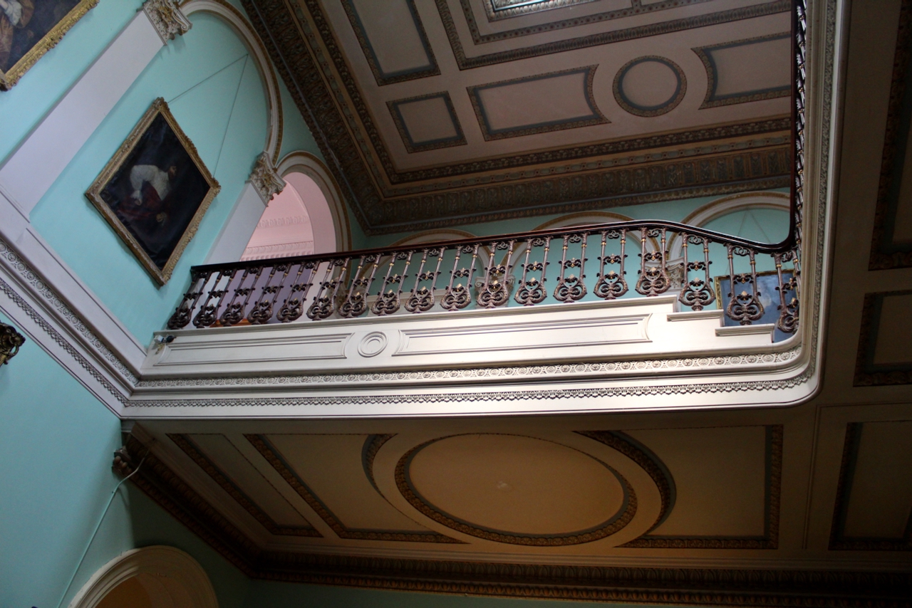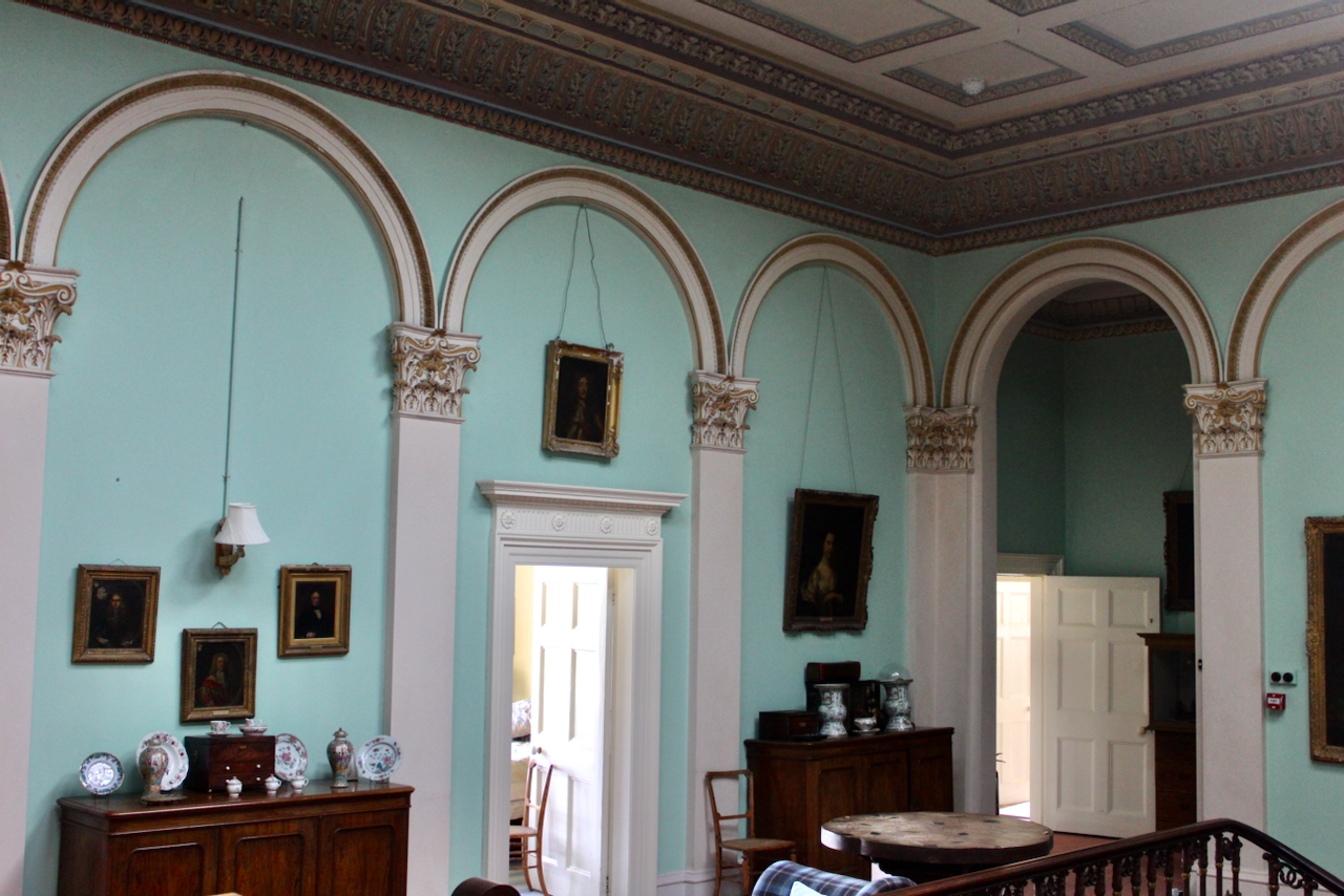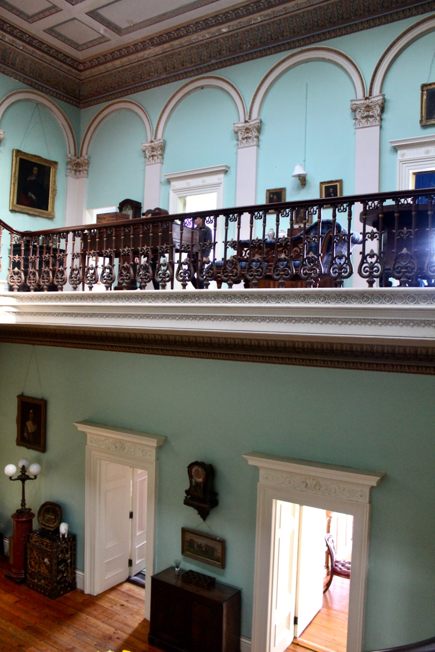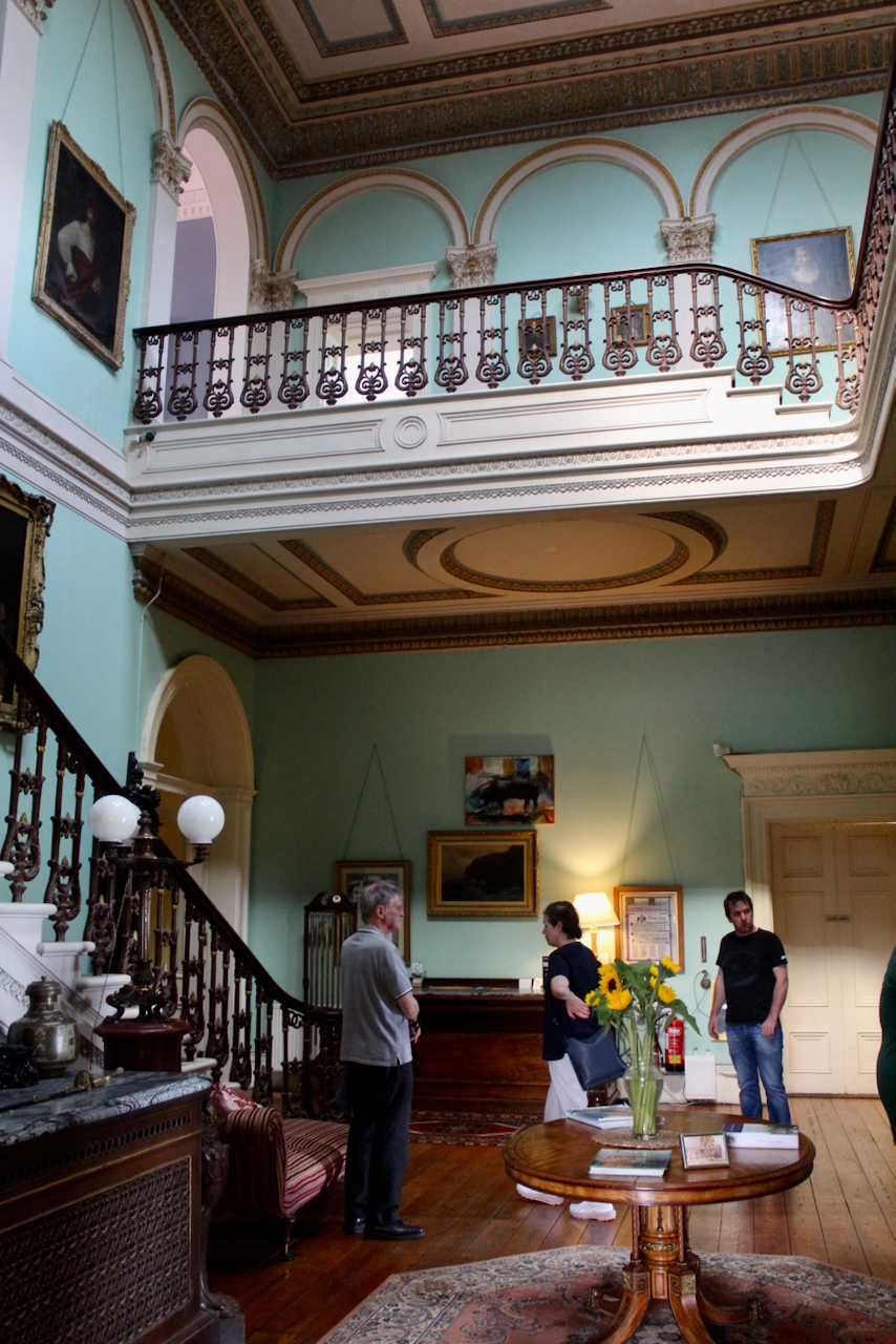 From the front hall we entered the top-lit double-height vestibule with a grand sweeping staircase and gallery lined with paintings of ancestors.
