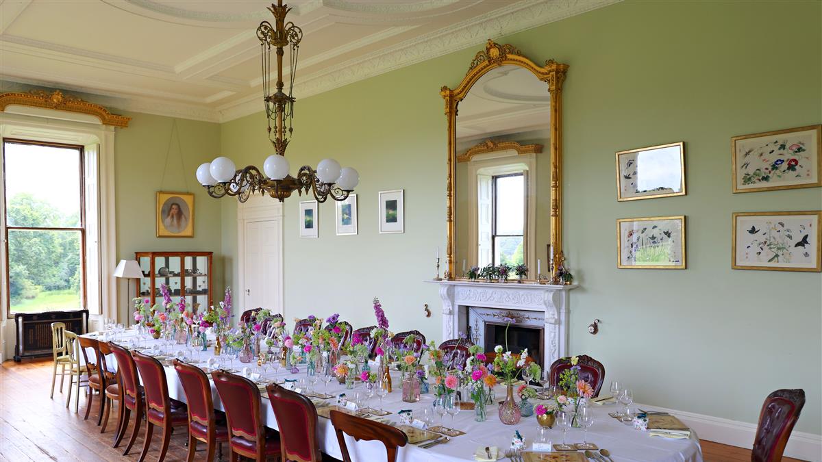 The duck-egg blue drawing room has a good white marble chimneypiece, and carved panelled shutters. Some of the shutters and other repairs to the house are salvaged from Long Orchard House, County Tipperary, home of Barrister and Master of the Mint Richard Lalor Sheil (setting of The Big Wind by Beatrice Coogan).