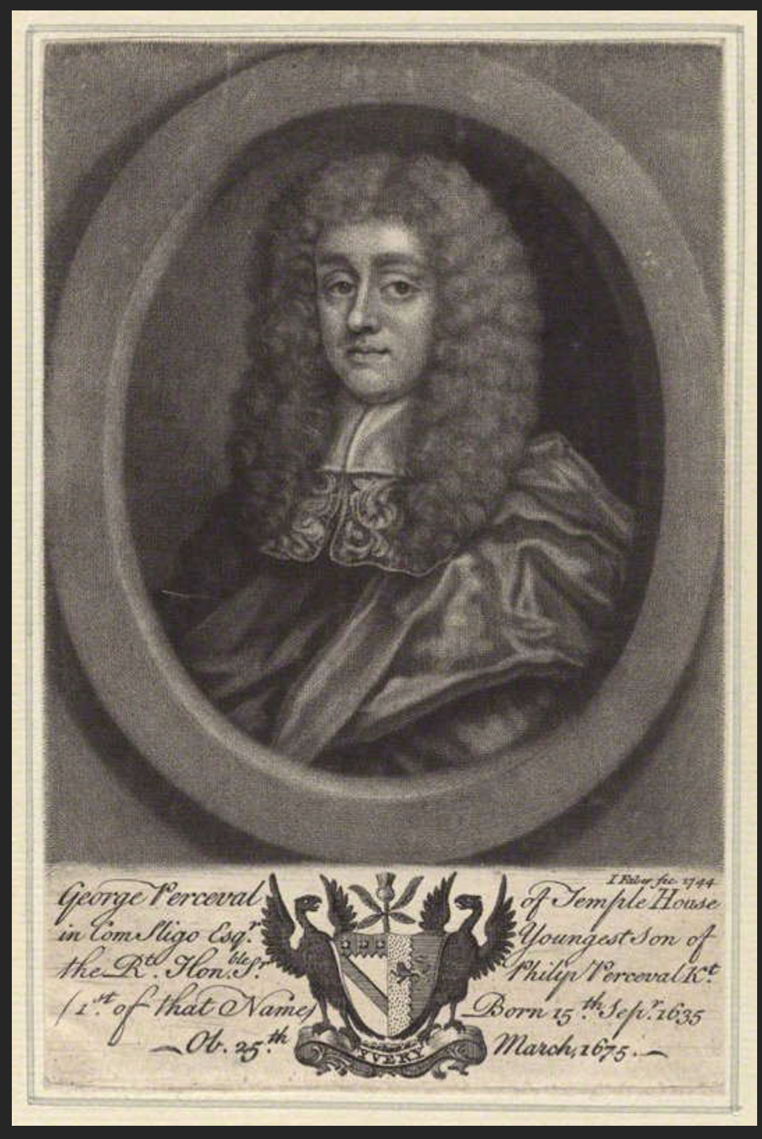 Philip Perceval married Catherine Ussher, daughter of Arthur Ussher and Judith Newcomen. She gave birth to their heir, John (1629–1665), who was created 1st Baronet of Kanturk, County Cork in 1661. George (1635-1675) was the younger son. He held the position of Registrar of the Prerogative Court in Dublin.