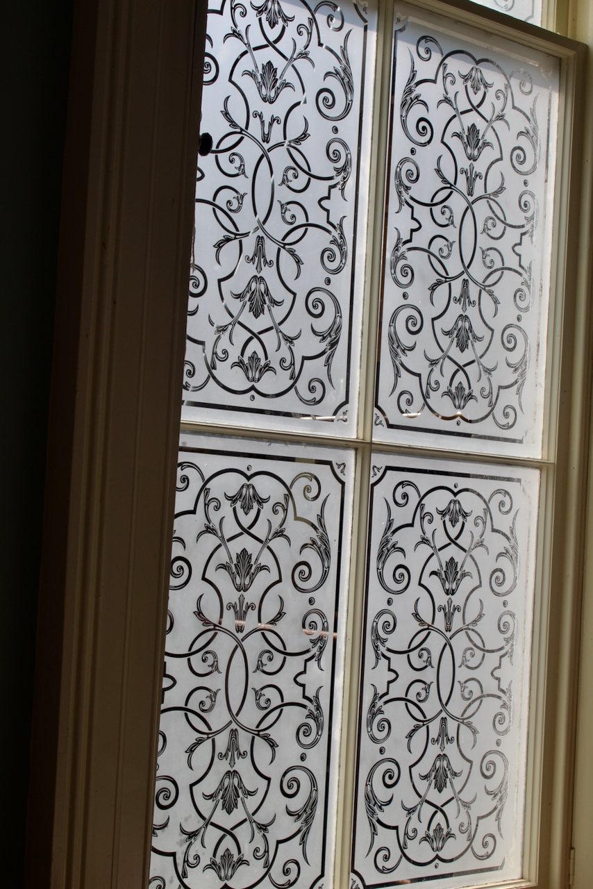 We gathered inside the front hall for the tour, with its impressive tiled floor and geometrically patterned ceiling. It has carved decorative doorcases and arched carved and shuttered side lights by the front door, and a large window facing the front door lights the room.