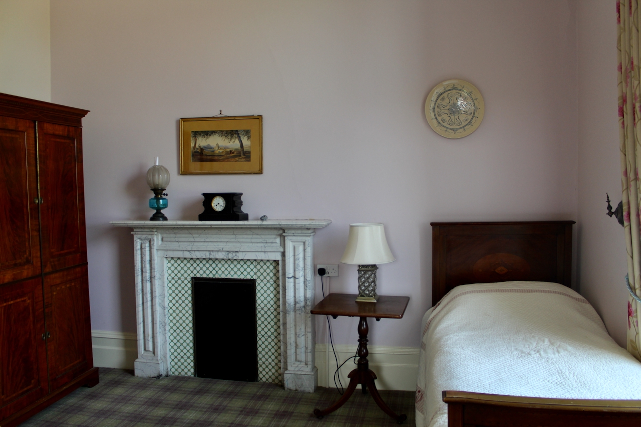 “From the elegant panelled hall, a striking curved staircase leads you to the first floor where you will find 3 double bedrooms and a large bathroom. The two front bedrooms overlook the sea and are elegantly decorated with material on the walls and fine furniture. One has an eighteenth century four-poster bed, the others have twin beds. The charming third room overlooks the gardens. The bathroom is worth noting for its historic bathtub, which used to belong to Winston Churchill!