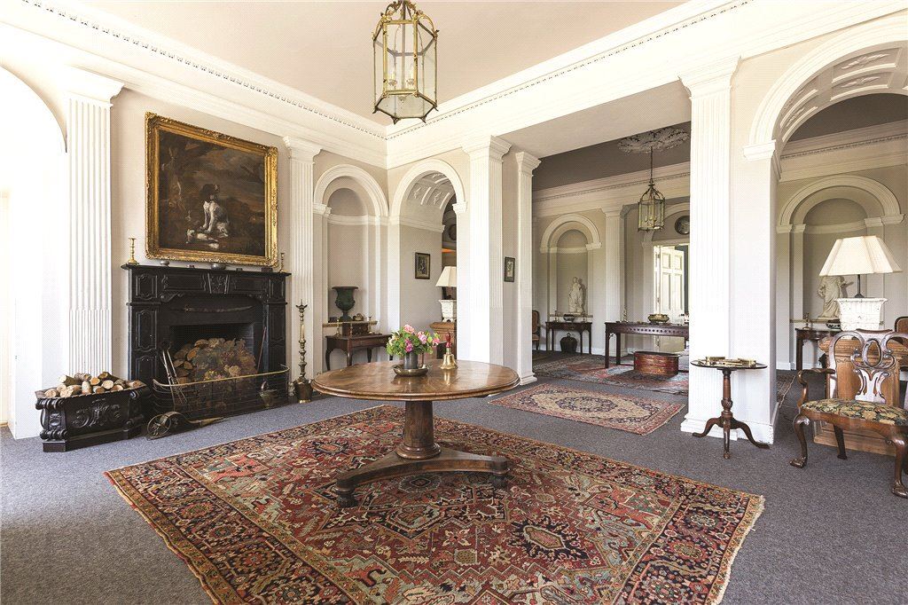 The drawing room and dining room are on either side of the entrance hall. The dining room on the west side has a coffered ceiling and a fireplace which is a copy of the west door of Magdalen College chapel, Oxford.