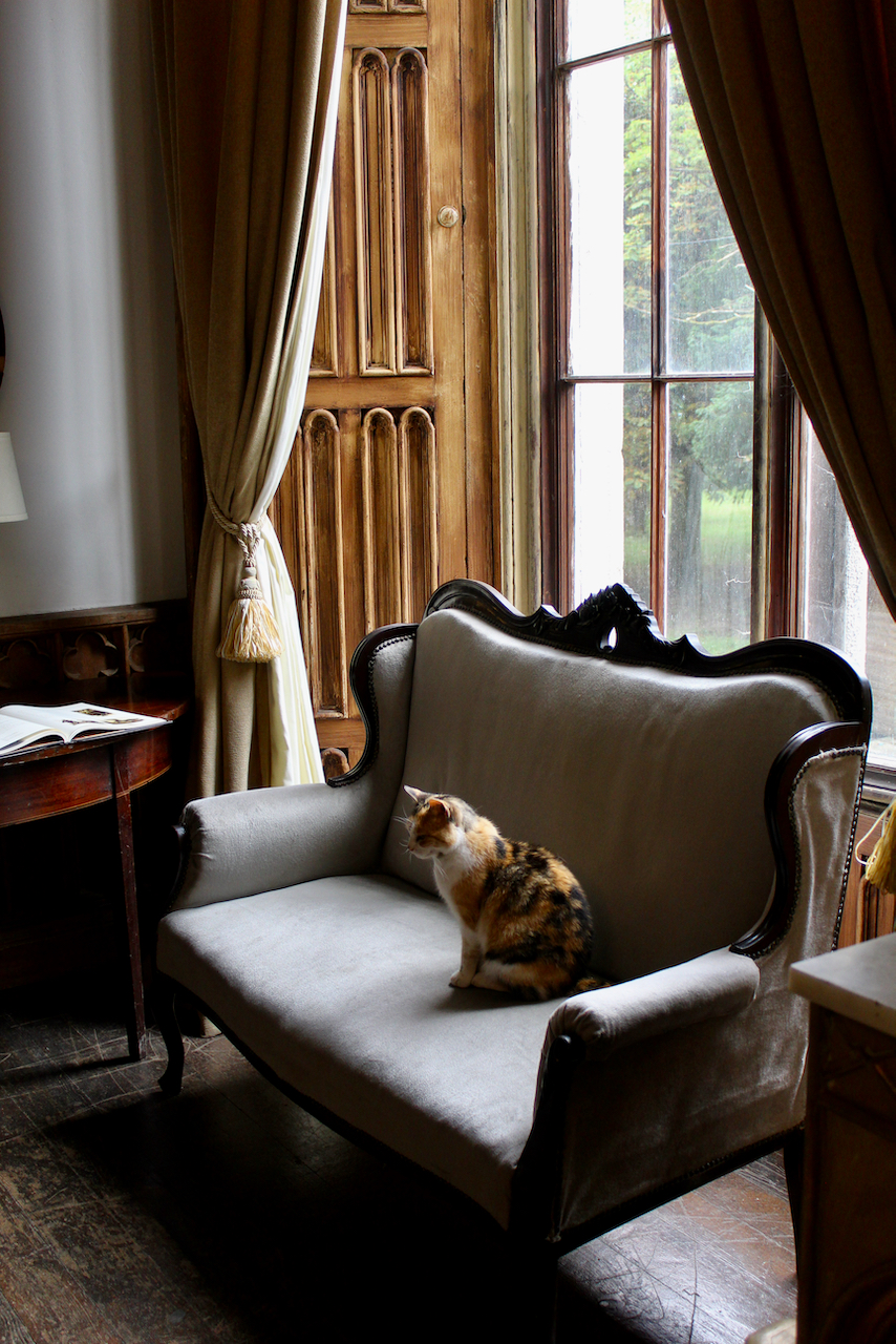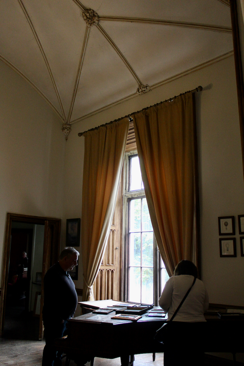 The Music Room connects via a curved short corridor to the Boudoir in the northeast tower, a homage to Walpole’s Tribune in Strawberry Hill, Tierney tells us. This used to be my friend Howard Fox’s bedroom when he was staying as a guest, leading mushroom foraging walks in Charleville Woods! It is a star-vaulted circular room, with bays alternating between four wide round niches and smaller openings for windows, door and fireplace. Above was Lord Charleville’s dressing room, but we did not get to go there.