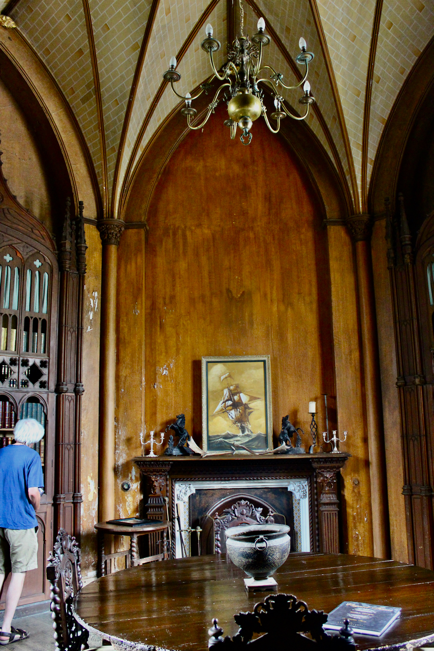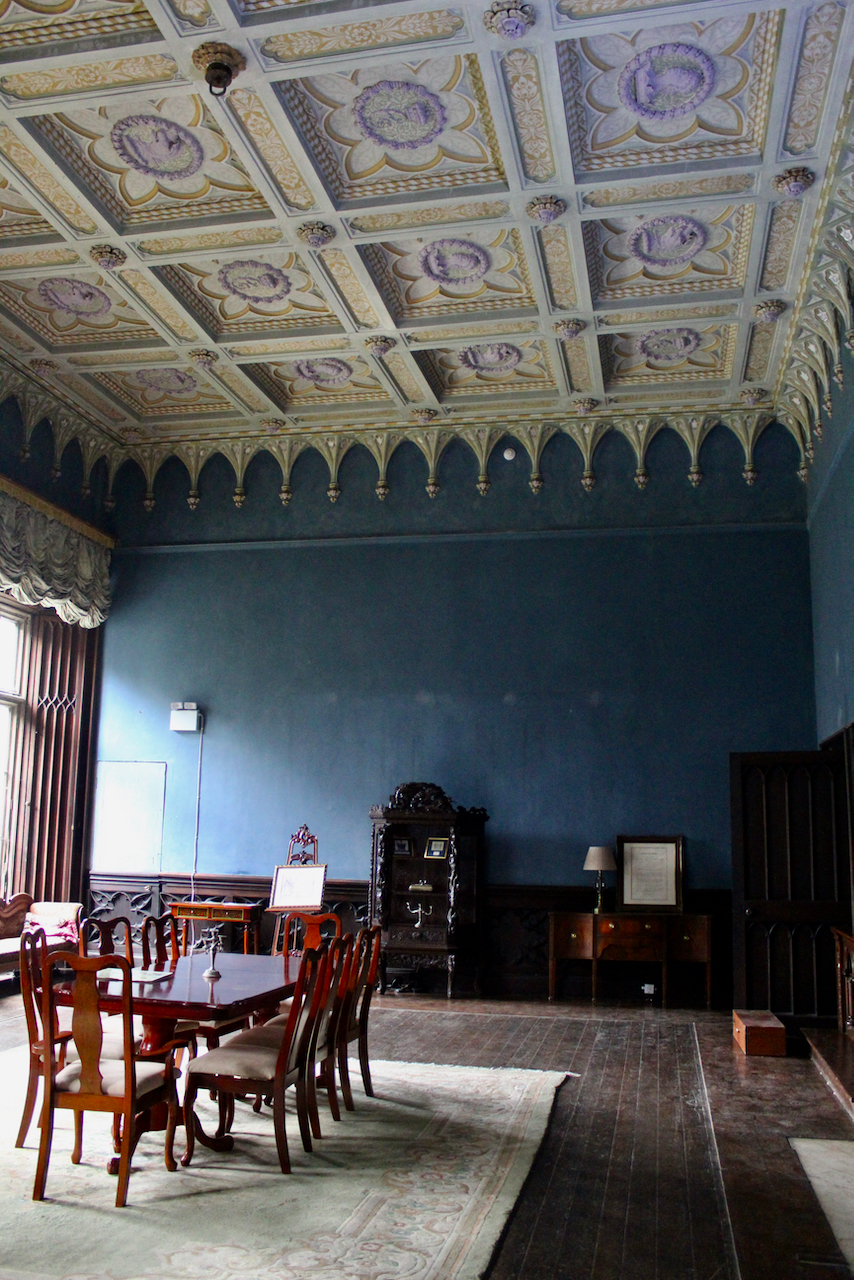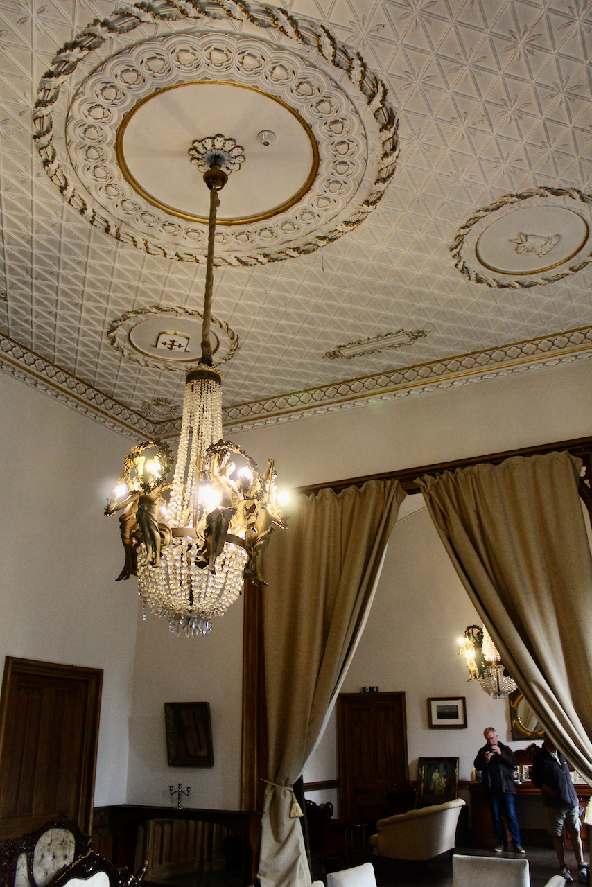 Through the double doors is the most splendid room, the south facing Gallery. Unfortunately this was closed on our Heritage Week visit in 2024 due to filming of the Addams family movie, “Wednesday.” Mark Bence-Jones continues:“This is one of the most splendid Gothic Revival interiors in Ireland; it has a ceiling of plaster fan vaulting with a row of gigantic pendants down the middle; two lavishly carved fireplaces of grained wood, Gothic decoration in the frames of the windows opposite and Gothic bookcases and side-tables to match.“