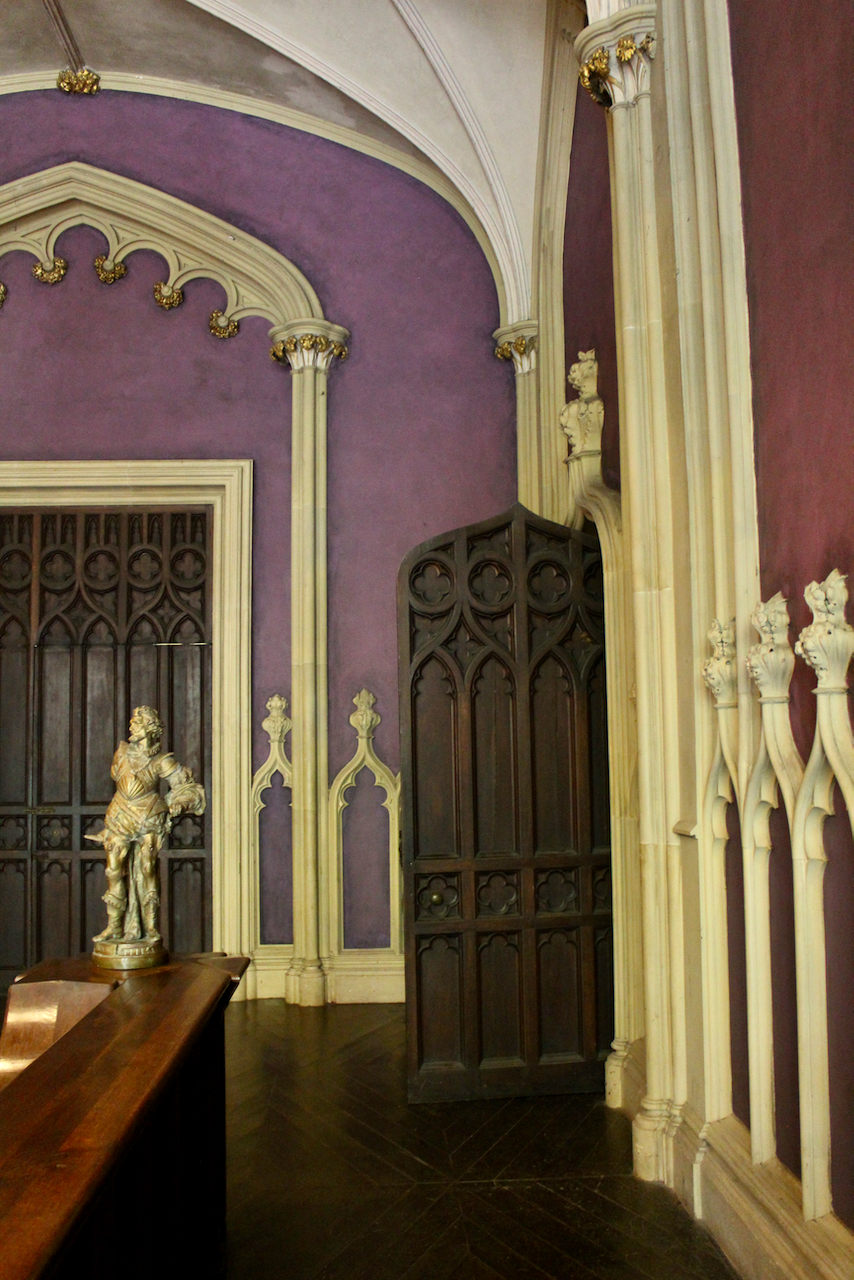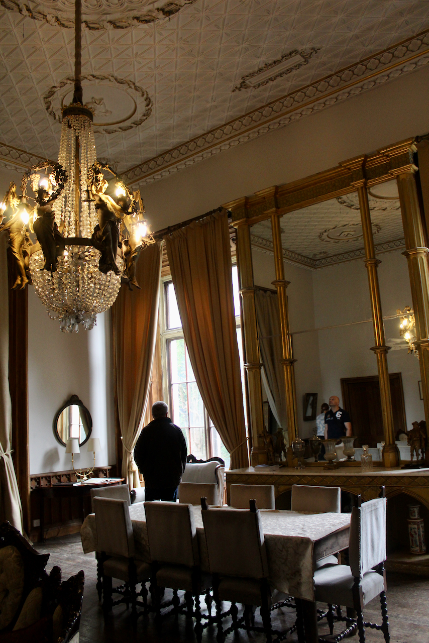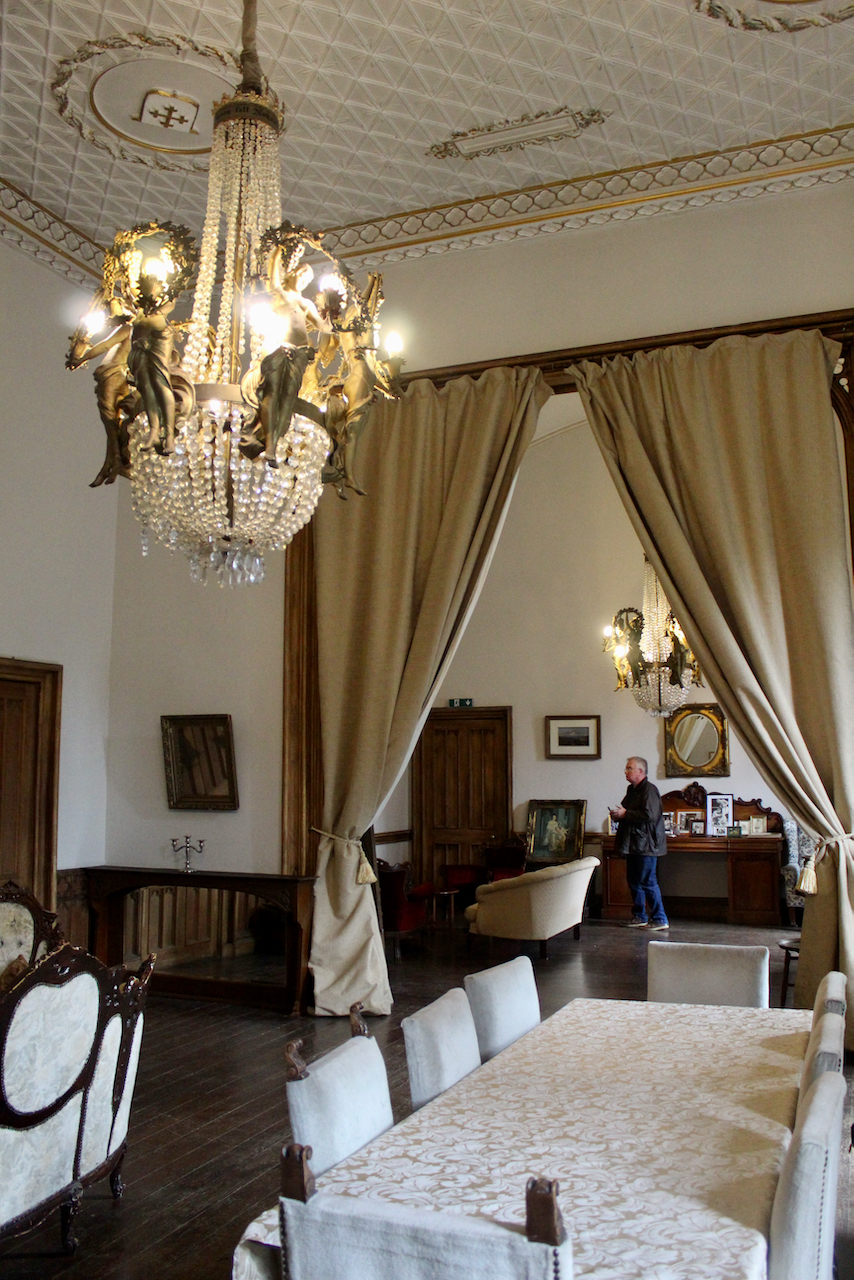 Through the double doors is the most splendid room, the south facing Gallery. Unfortunately this was closed on our Heritage Week visit in 2024 due to filming of the Addams family movie, “Wednesday.” Mark Bence-Jones continues:“This is one of the most splendid Gothic Revival interiors in Ireland; it has a ceiling of plaster fan vaulting with a row of gigantic pendants down the middle; two lavishly carved fireplaces of grained wood, Gothic decoration in the frames of the windows opposite and Gothic bookcases and side-tables to match.“