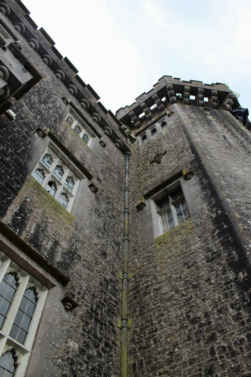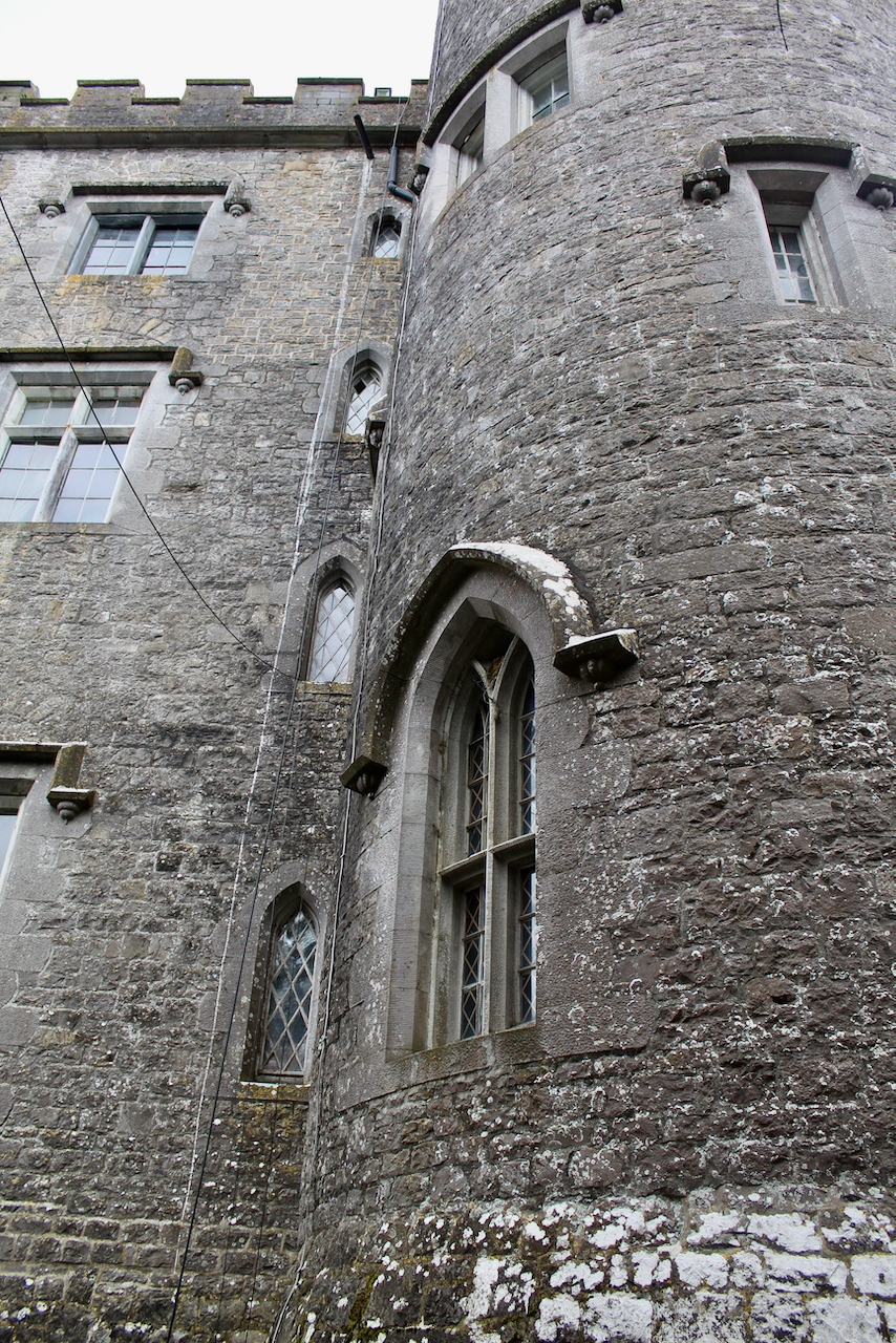 Tierney continues: “The positioning of a great window over the doorway bears comparison with the earlier group of Pale castles, such as Castle Browne (now Clongowes Woods school), attributed to Thomas Wogan Browne. It appears as a portcullis descending from a Gothic arch with a drawbridge in Lord Charleville’s original drawing (which also had a Radcliffean damsel in distress screaming from the battlements). He spent a lot of time drawing a sevenlight panelled window in its stead – the effect is much the same from afar – although the executed window is a more complex Perp design, probably by Johnston. The Tudor arch is employed three times in succession: over the door, in the recess of the great window and in the tripartite window above, which is subdivided into three further arches. This use of the same detailing at varying scales is also seen in the corbelling – a sort pair of intersecting hemispheres. The battlements are simple crenels on the main block but on the towers are rendered in a distinctly Irish fashion (a distinction Johnston would make at Tullynally and Markree), and here the corbelling is also more elaborate, sprouting upwards like cauliflower on the NE tower.“