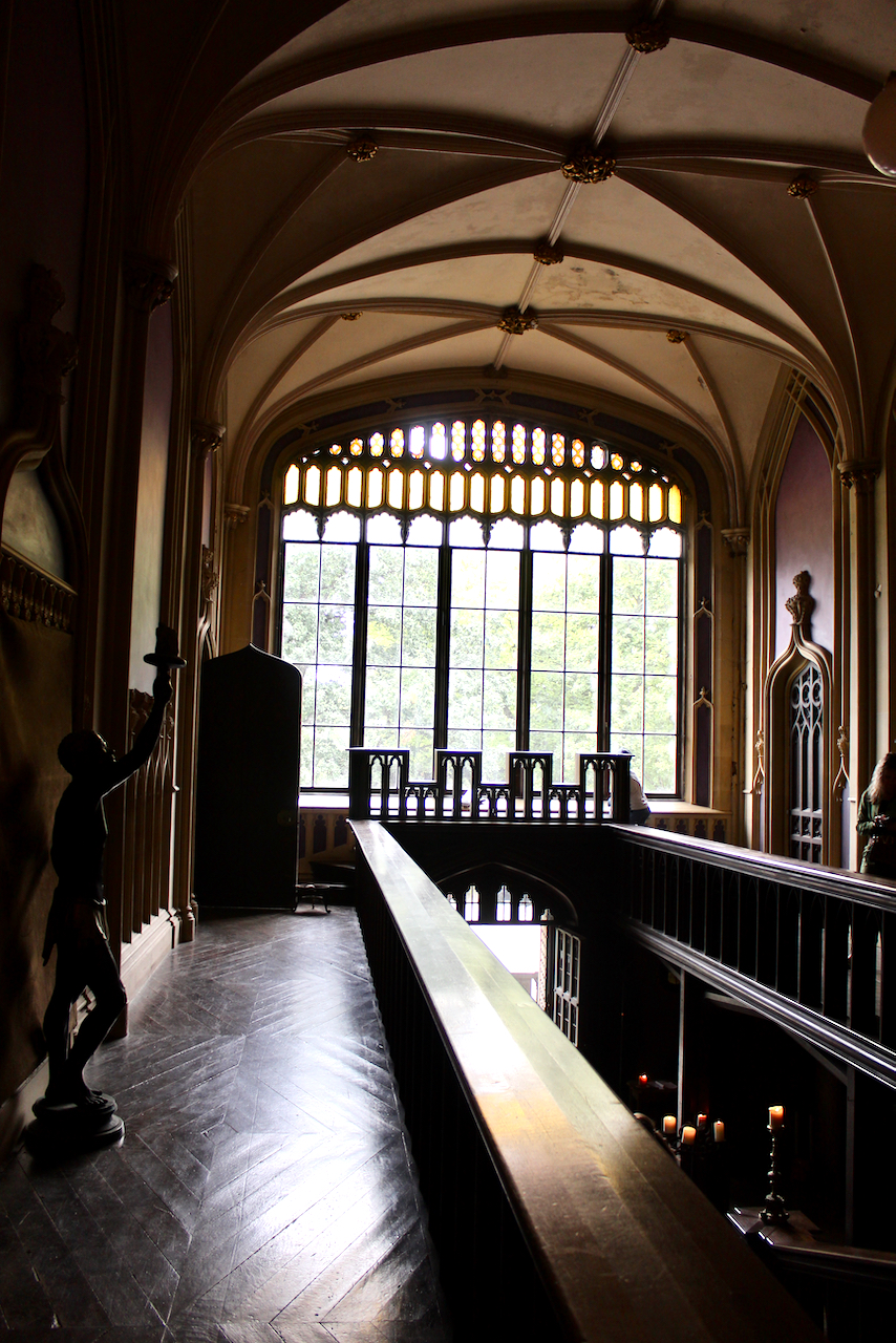 A tragic accident occurred in 1861 when the 5th Earl’s young sister Harriet was sliding down the balustrade of the Gothic staircase from the nursery on the third floor and fell. She is said to haunt the staircase and to be heard singing.