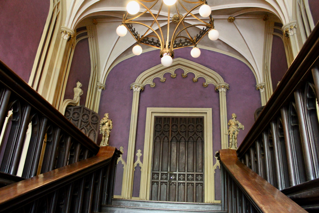The stairs is tucked away in an odd place, behind a door off the northwest corner of the entrance hall. It is an intricate tightly curved staircase of Gothic joinery leading to the upper storeys, with Gothic mouldings on walls. The wall panelling is plaster painted and grained to look like oak. It rises through three storeys.