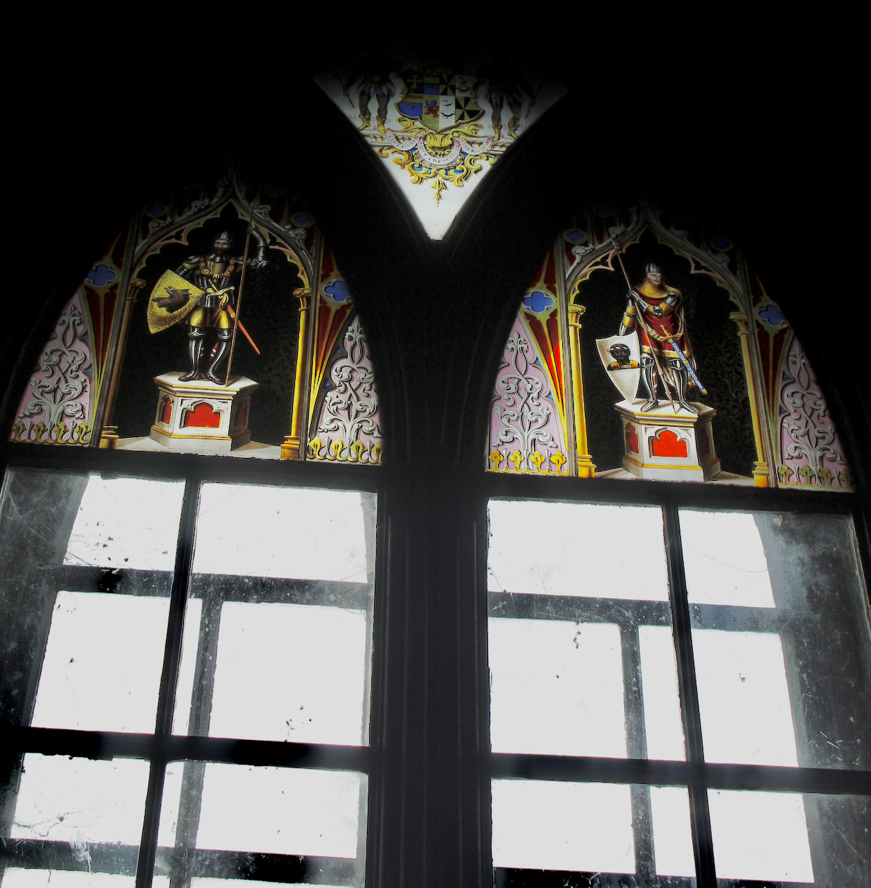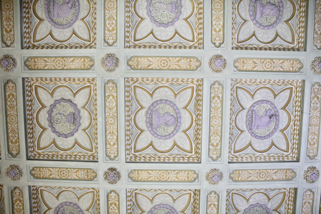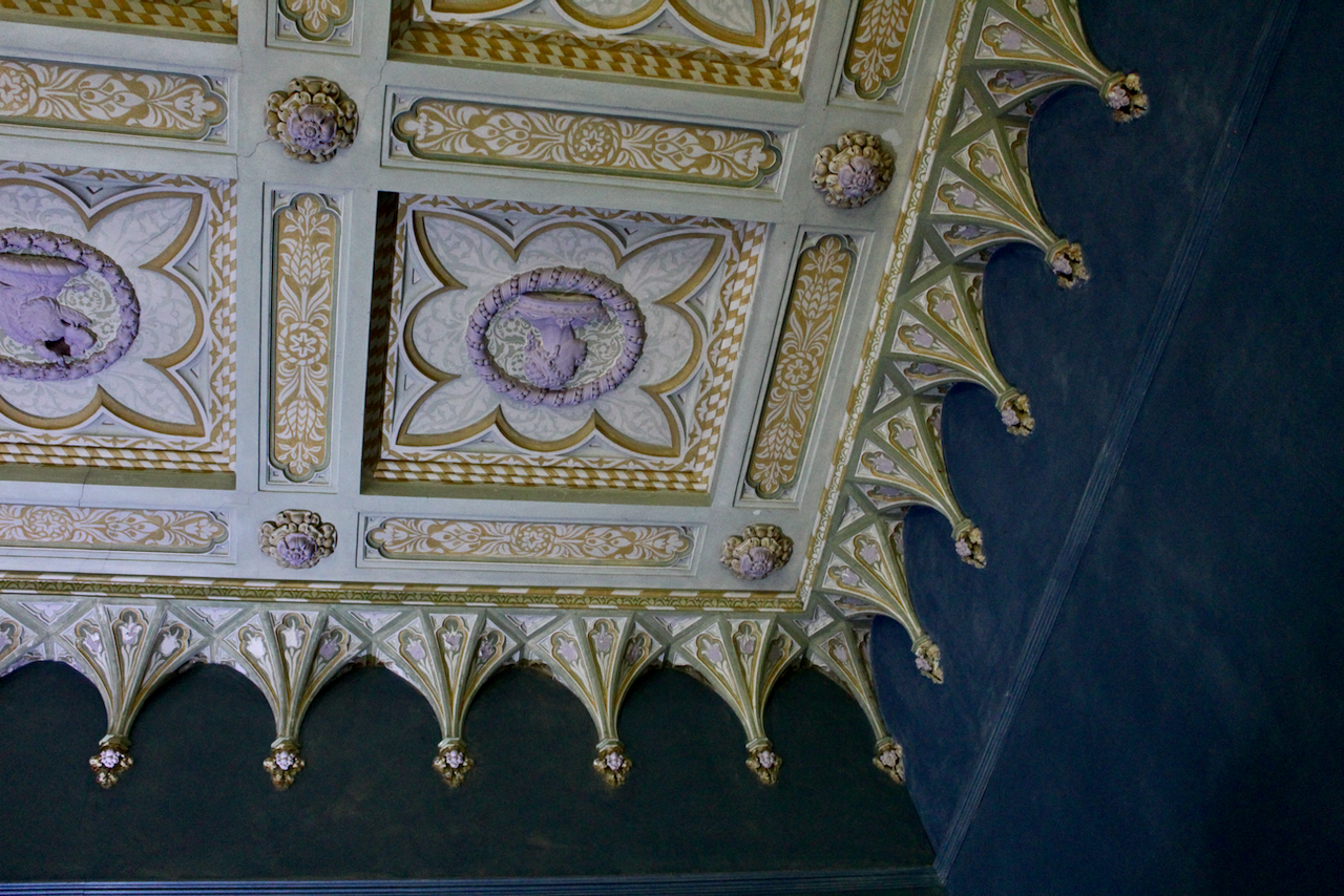 The dining room has, Tierney points out, a Dado of double-cusped panelling derived from the staircase balustrade of Strawberry Hill. The ceiling has crests of the family in the panel, supported by a Gothic frieze in the form of miniature fan vaults. The Moores are represented by a silhouette of a Moorish person, and the Burys by a boar’s head with an arrow through its neck. There are also “C”s for “Charleville.” The volunteers during Heritage Week told us that the ceiling is by William Morris, but Tierney tells us that he redecorated the room in 1875, but the scheme no longer survives. The decoration on the miniature fan vault frieze does look rather William Morris-esque to me, as well as the painting between the crests.