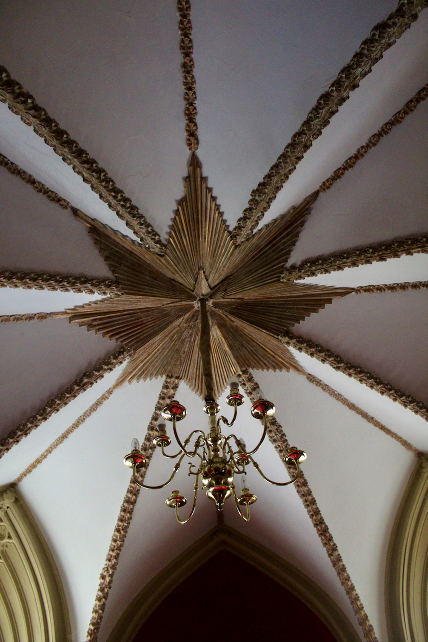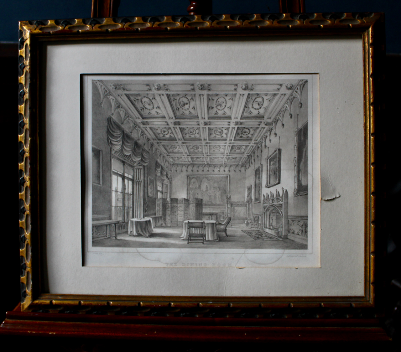 The Drawing Room is on the east side of the house. It has a fretwork ceiling with circular heraldic panels, a panelled dado and quatrefoil cornice. The room connects through a great arch with the rib-vaulted music room to its north. Unfortunately none of the furniture is original to the house but was brought it by the current owners.