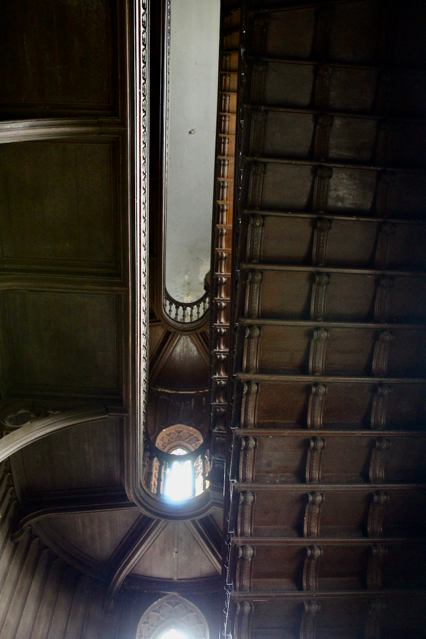 The heavy oak stairs run from the basement to piano nobile. This imitates a similar configuration by James Wyatt at Fonthill and Windsor, which Lord Charleville knew. The upper stage, Tierney describes, has a plaster-panelled dado with ogee-headed niches in the style of Batty Langley, conceived for a parade of suits of armour in drawings by Lady Charleville.