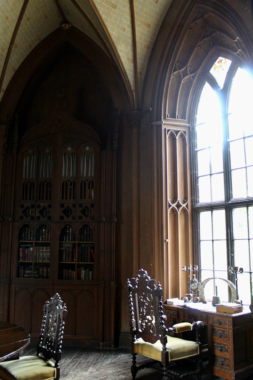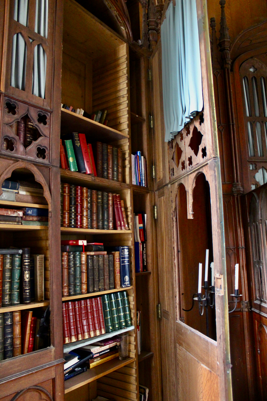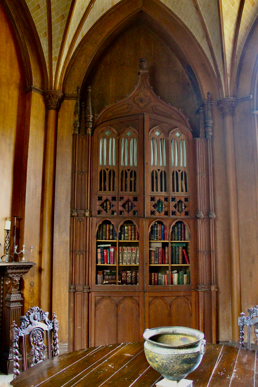 Beyond the staircase on the primary level is a small library with rib vaulted ceiling and Gothic bookcases.