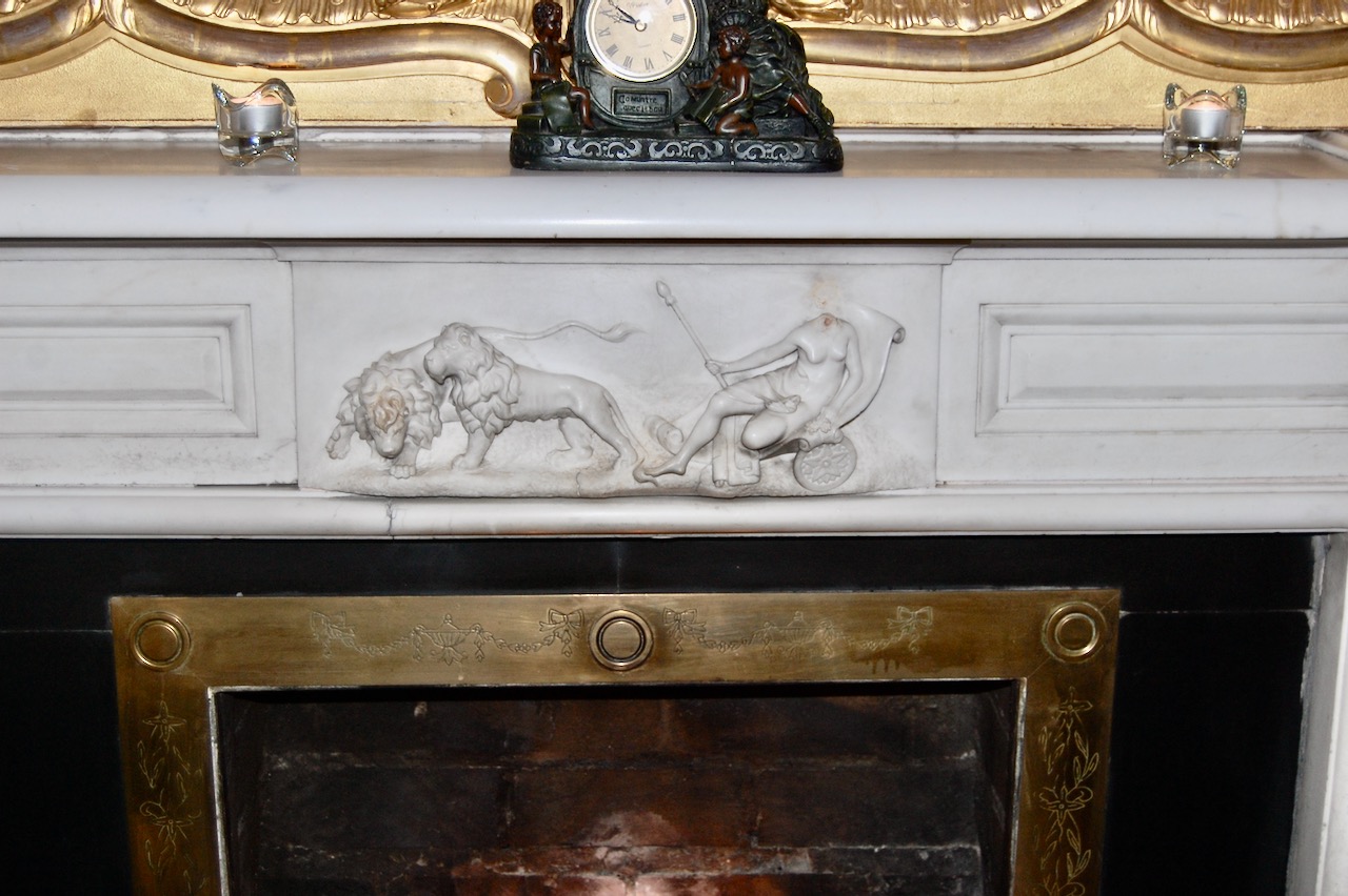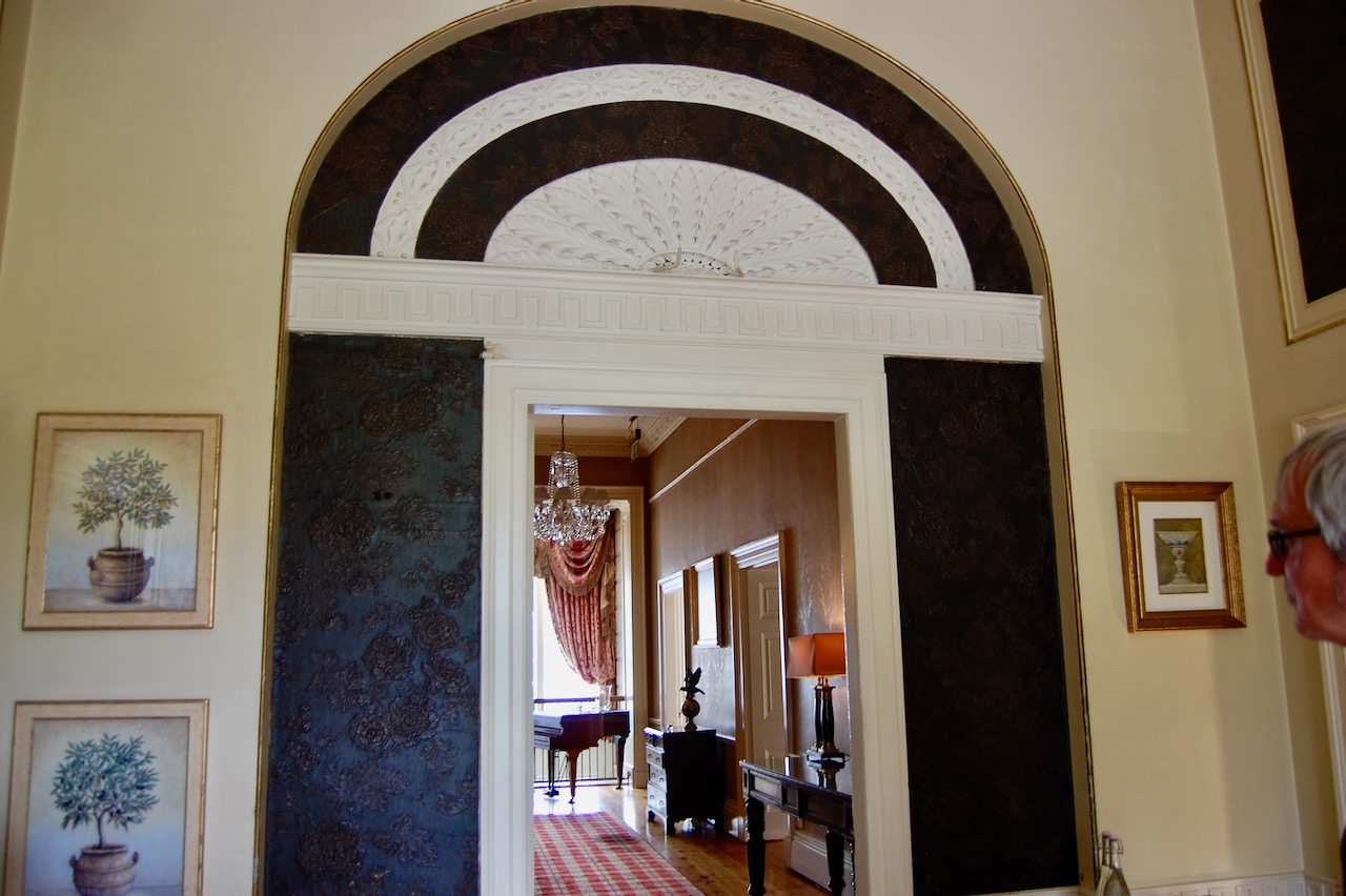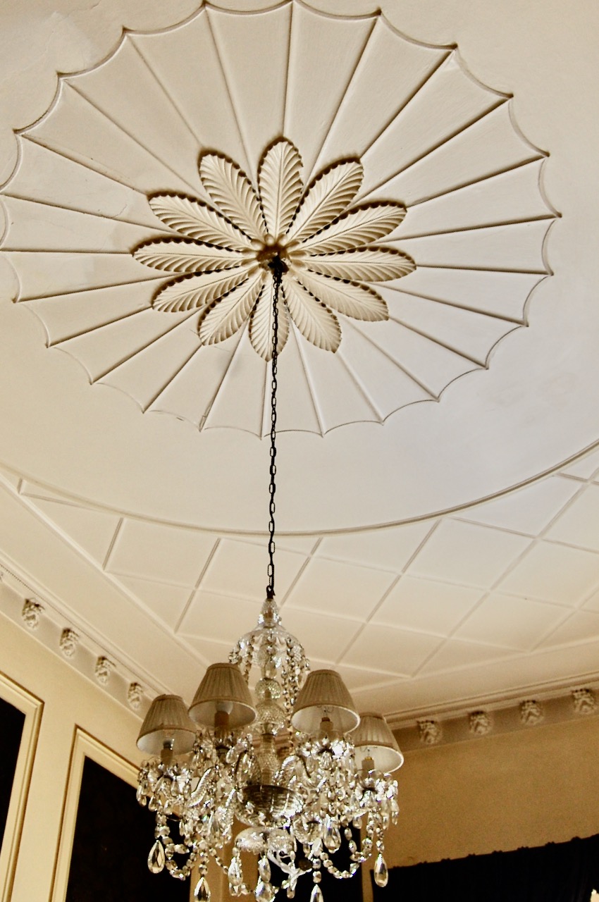One entire room is dedicated as a “cabinet of curiosities.” Desmond Guinness and Desmond FitzGerald tells us in their entry about Newbridge House in Great Irish Houses that the collection may have started life as a shell collection in the 1790s by Elizabeth Beresford (1736-1860), who married the archbishop’s son Colonel Thomas Cobbe (1733-1814). She came from Curraghmore in County Waterford (see my entry on Curraghmore) and would have been familiar with her mother’s Shell Cottage. Much of what we see in the collection today comes from the Indian subcontinent, including a Taj Mahal in alabaster, ostrich eggs, corals, statues of house gods, snake charmer’s box and tusks with carving noting the abolition of slavery [see 12]. The oriental theme is even carried through to the elephant design curtains. The panels on the wall are reproduction of the originals.