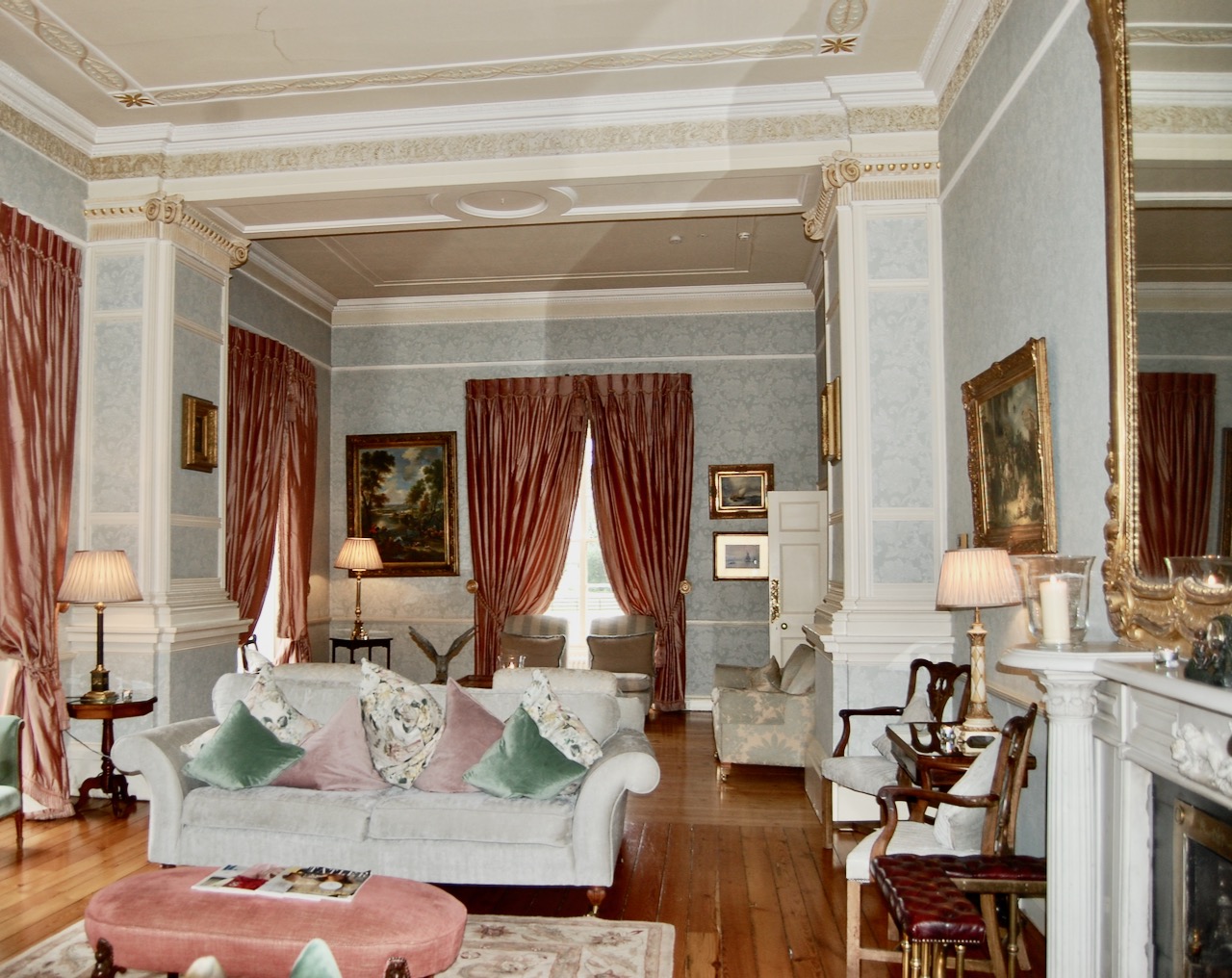The Drawing room was largely destroyed in a fire in 1941, and was reconstructed in 1968 in 18th century style. It is heavily mirrored with five large Waterford crystal chandeliers.