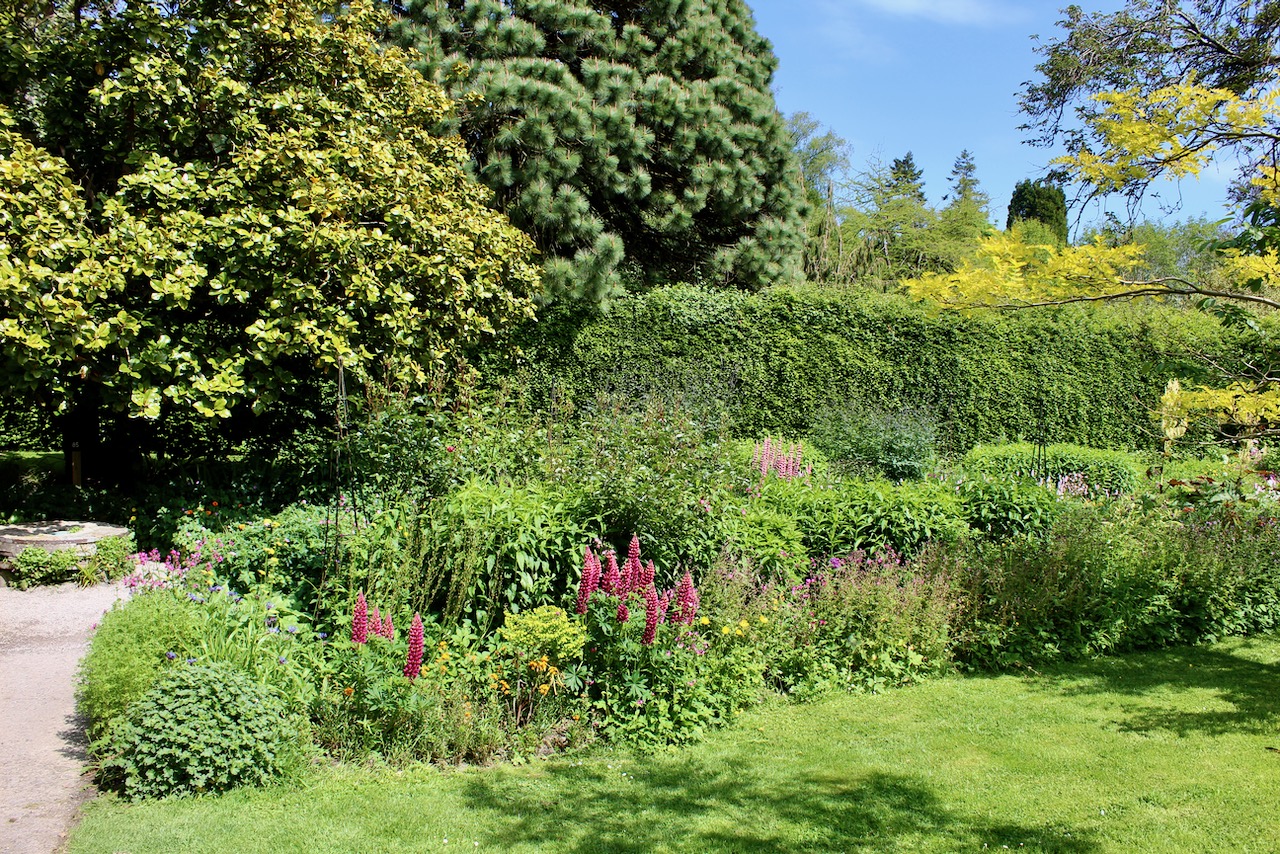 At the centre of the garden is a restored Gothic style summerhouse. The main house is of Queen Anne design, from the 18th century. Pergolas, a lily pond, Victorian stone fernery, a woodland walk and river garden, a rockery and wild water garden create an atmospheric setting.
