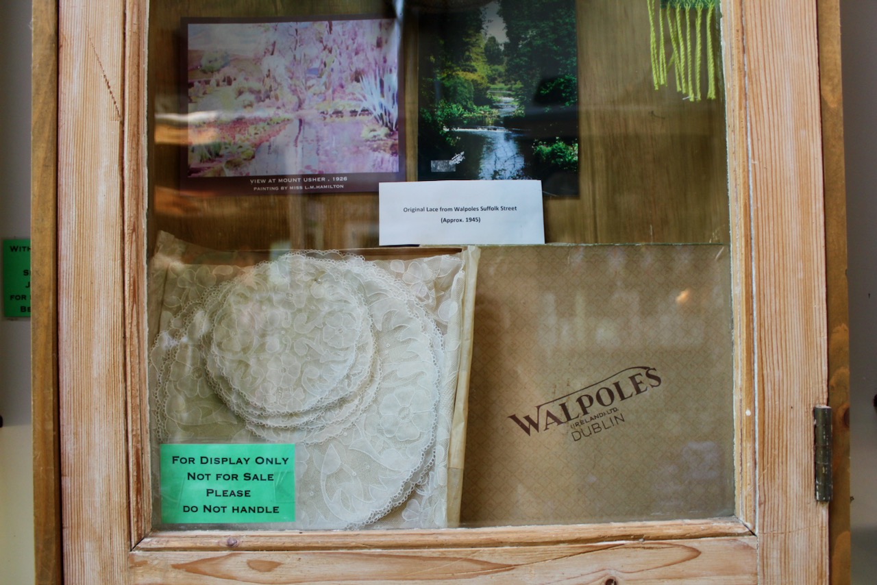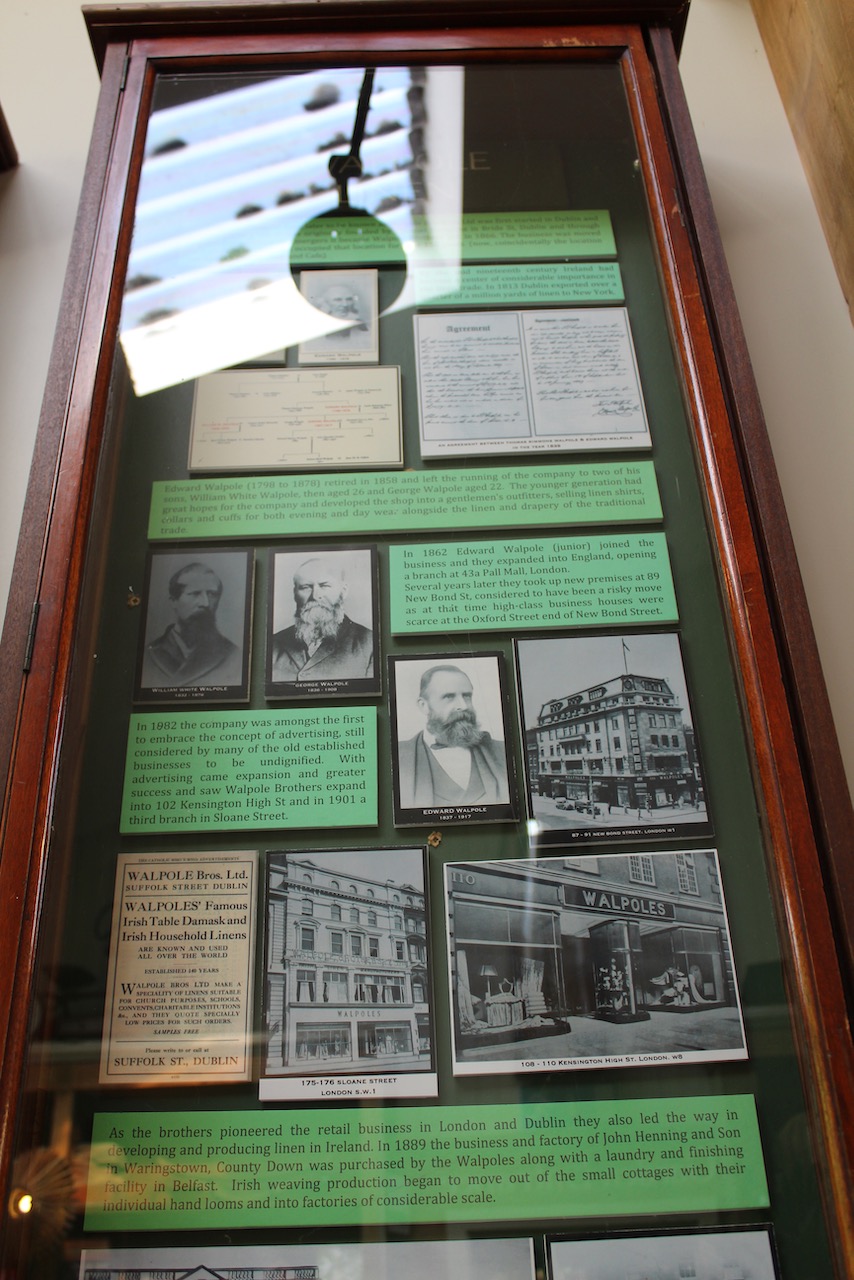 The museum tells us that Edward Walpole (1798-1878), a successful Dublin businessman, enjoyed walking in Wicklow, and he stayed in a hotel on weekends to indulge his passion. The Walpole family was involved in linen manufacturing. Thomas Simmons started a linen business in Bride Street in Dublin in 1766, and through mergers and a marriage it grew into Walpole Brothers Limited by 1866. Coincidentally, in 1816 the business moved to Suffolk Street in Dublin and occupied what is now Avoca Shop and Cafe on that street.
