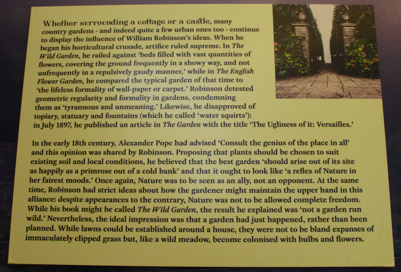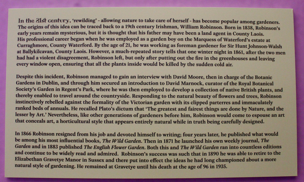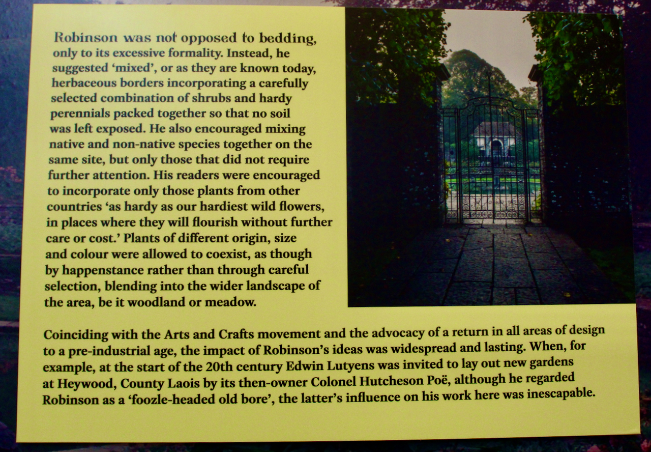 William Robinson (1838-1935) was born in Ireland. His first job was in Curraghmore, County Waterford. He progressed to become the foreman gardener in Ballykilcavan, County Laois, employed by Sir Hunt Johnson-Walsh. In 1862 Robinson found employment at the Royal Botanic Society’s garden at Regent’s Park in England. He resigned four years later in order to further his knowledge of gardening, and to write. He travelled in France and later more widely in Europe and the United States, and published books on horticulture. His most important work is The English Flower Garden (1883). [6] The Robinsonian style of gardening is to work with nature, as opposed to imposing order.