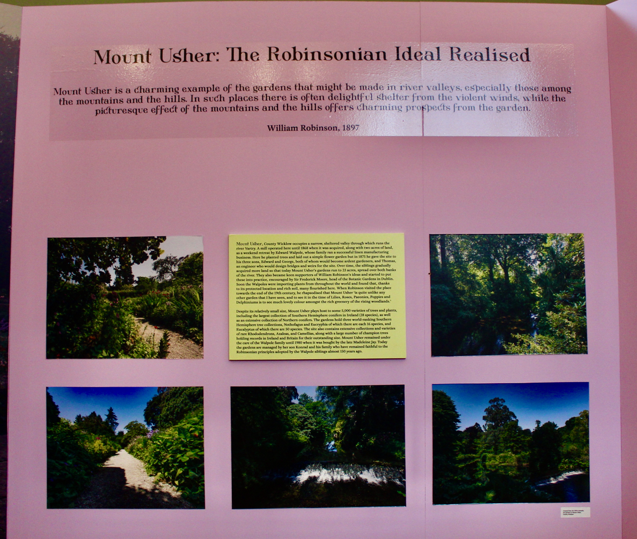 Mount Usher had originally been a “tuck mill” where local people brought their home spun and woven cloth to be finished. This may be how Edward Walpole came across this location. He took over the lease of Mount Usher in 1868 and began to develop his garden, with the help of his sons. Seven years later, in 1875, he transferred the land to his sons: Thomas, George, William White and Edward. William White and George also continued in the Linen business, and developed their shop into a Gentlemen’s Outfitters. Their younger brother Edward joined the business and expanded to London.