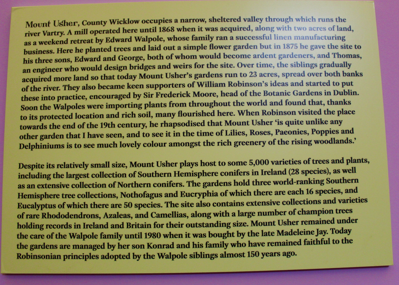 Walks and woods were added to the property as more land was acquired. The family also owned a house called Windsor Lodge in Monkstown in Dublin. Mount Usher passed to Edward Horace Walpole, the son of Edward Walpole (1837-1917) and Elizabeth Harvey Pim [perhaps his parents were fans of the writer, Horace, or Horatio, Walpole (1717-1797), who most famously wrote the Gothic novel The Castle of Otranto and who also embraced the Gothic style in his home, Strawberry Hill in southwest London – or perhaps they were related]. For over fifty years, Edward Horace enlarged and improved the garden, with the help of his head gardener, Charles Fox. Rare varieties of plants from China, Japan, the Himalayas, Chile, New Zealand and North America were added.