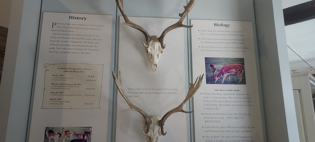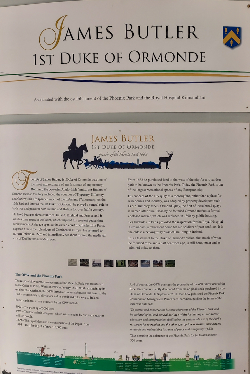 “It was originally formed as a royal hunting Park in the 1660s [by James Butler, 1st Duke of Ormond, for King Charles II] and opened to the public in 1747. A large herd of fallow deer still remain to this day. The Park is also home to the Zoological Gardens, Áras an Uachtaráin, and Victorian flower gardens. The Phoenix Park is only a mile and a half from O’Connell Street. Both passive and active recreational pursuits may be viewed or pursued such as walking, running, polo, cricket, hurling, and many more. The Glen Pond is set in very scenic surrounds in the Furry Glen. There are many walks and cycle trails available to the public.“