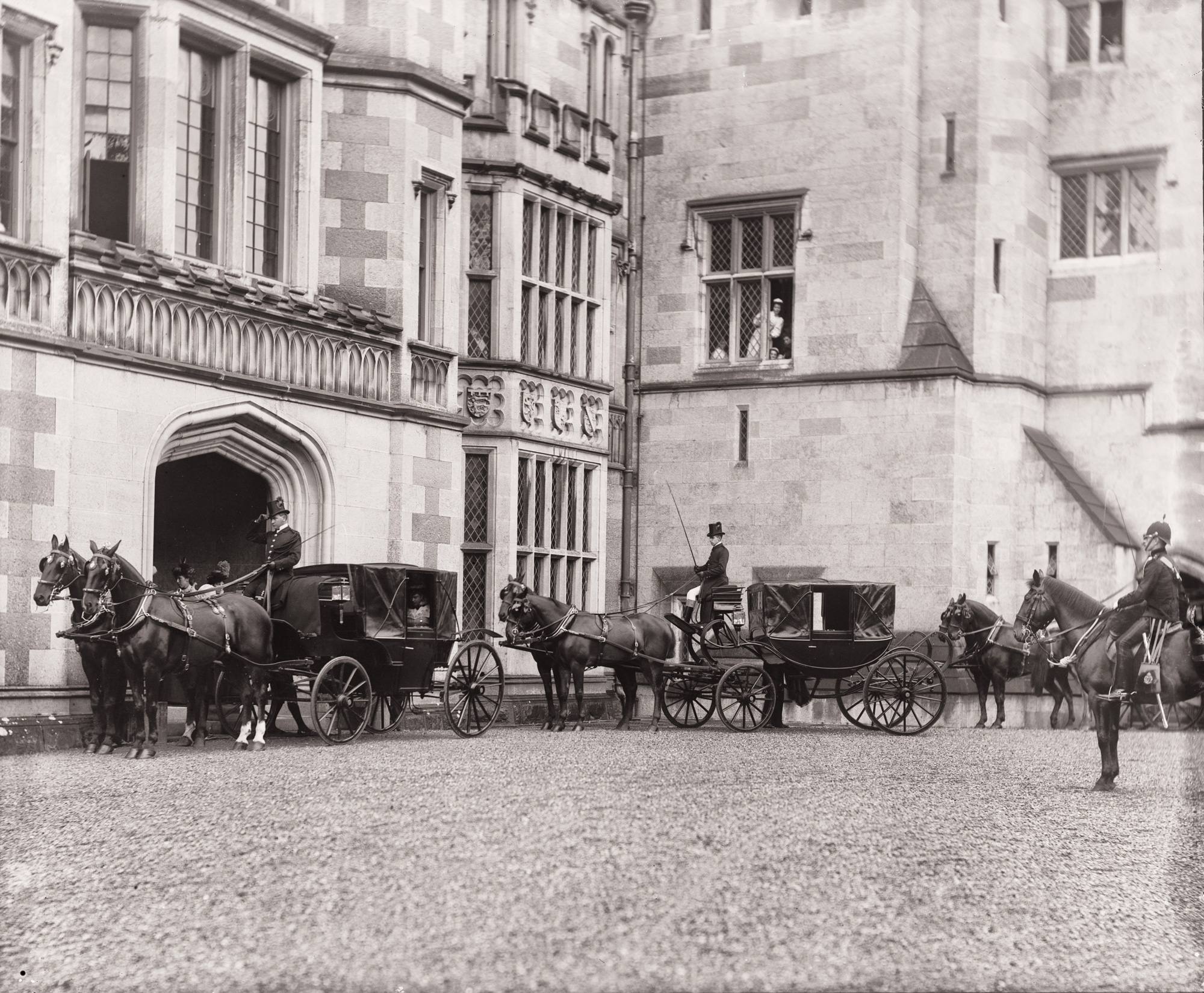 “The entrance front is approached through a gatehouse copied from that of Rockingham Castle, Northamptonshire. The stonework is of excellent quality and there is wealth of carving; the entrance door is flanked by the figures of Edward I and Eleanor of Castille; while the look-out tower is manned by a stone soldier. Groined entrance hall; staircase of dark oak carved with animals, foliage and Celtic motifs, hemmed in by Romanesque columns; drawing room with mirror in Norman frame. Octagonal library at the base of the round tower, lit by small windows in very deep recesses; the vaulted ceiling painted with blue and gold stars; central pier panelled in looking-glass with fireplace. Elaborately carved stone Celtic-Romanesque doorway copied from Killaloe Cathedral between two of the reception rooms. Glen with fine trees and shrubs; river and lake, many-arched bridge. Now a Benedictine Abbey and a well-known boys’ public school.”